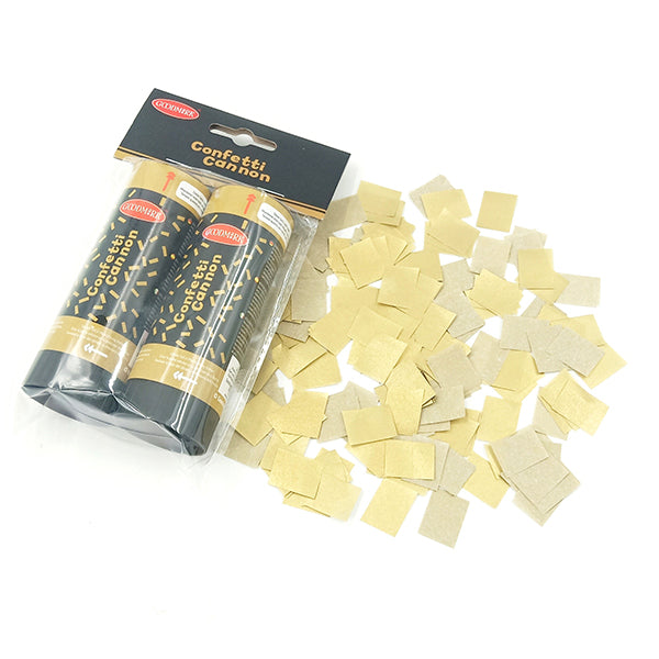 2 canons de fête dorés 11 cm. Contenu de longues et courtes bandes de feuille d'or.