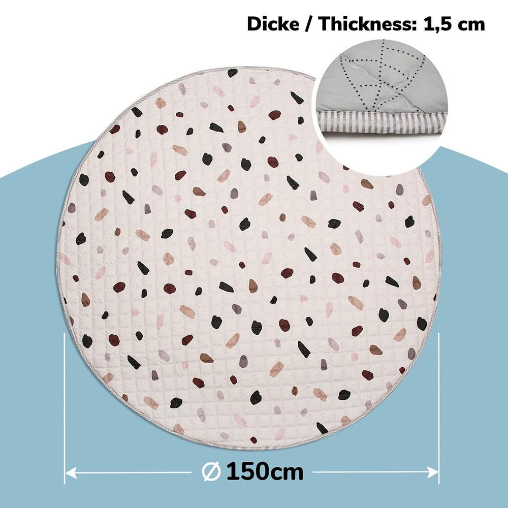 La couverture d'éveil pour bébé au design confettis unisexe embellit avec style votre intérieur dans le salon ou la chambre d'enfant et ravit en même temps votre bébé. Les belles couleurs pastel douces du tapis d'éveil s'intègrent parfaitement dans votre décoration intérieure et procurent une sensation d'harmonie et de confort. Avec un diamètre généreux de 150 cm et une épaisseur de 1,5 cm, la couverture matelassée offre beaucoup d'espace pour ramper et jouer, pour des exercices de yoga et de sport ou pour des pique-niques en plein air. Le tapis de jeu pour enfants est facile à nettoyer et convient au lavage en machine à 30°C. Les picots en caoutchouc à l'arrière du tapis pour bébé assurent un plaisir de jeu et d'exploration antidérapant. Grâce à la bonne adhérence du tapis de jeu au sol, il protège votre bébé en cas de chute. Le tapis de jeu pour enfants est fabriqué en tissu polyester doux et doux pour la peau. Le matériau est conforme aux normes REACH et répond également à toutes les normes de sécurité des produits de l'UE. La couverture est livrée scellée sous vide. Cela permet d'économiser de l'espace et de réduire les émissions de CO2 pendant le transport.
