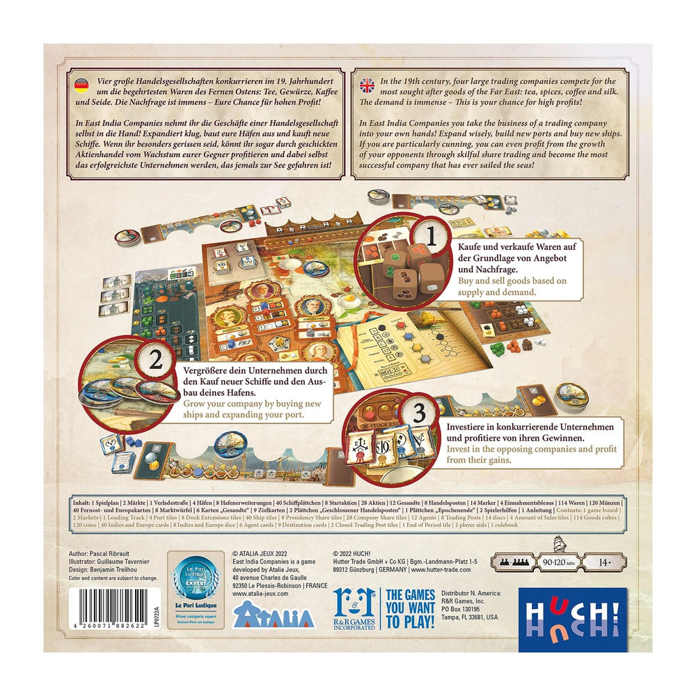 Dans East India Companies, les joueurs gèrent une grande compagnie maritime qui fait du commerce avec des comptoirs commerciaux éloignés en Inde. Ils doivent gérer leurs navires et investir dans l'achat d'actions de leur propre entreprise et de celles de leurs concurrents. Et surtout, les joueurs doivent garder un œil sur les taux du marché en constante fluctuation ! Vaut-il mieux investir son argent en bourse ou dans l’achat de biens ? Préférez-vous utiliser des navires rapides avec un faible tonnage ou des navires plus lents avec des cales plus grandes ? Quel que soit le choix des joueurs, leur stratégie influencera celle de leurs adversaires.