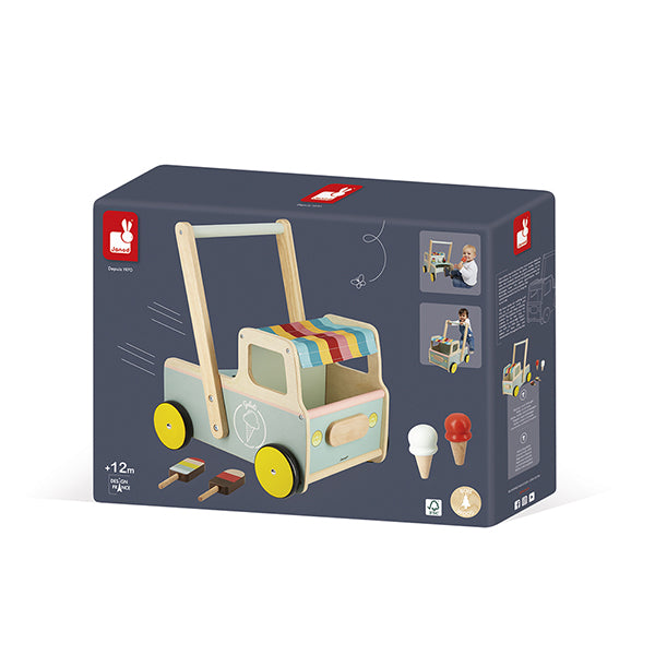 Qui veut une glace ? Fraise ou vanille ? En sac ou sur bâton ? Toutes les saveurs sont disponibles chez Eismann ! Laissez votre enfant s'amuser et faire ses premiers pas avec cette poussette 2 en 1 : poussette et marchand de glaces à la fois. Ce chariot est doté d'une grande boîte avant pouvant contenir une peluche et 4 morceaux de glace en bois. Il y a aussi un petit débarras à l'arrière pour garder les glaces au frais. Pour faciliter la livraison de la glace, le chariot est également équipé de roues silencieuses et d'écrous de blocage pour bloquer les roues. Une véritable réplique de wagon qui développe l'imagination et la motricité de votre enfant. Jouets en bois FSCTM et aquarelle. Trotteur pour enfants à partir de 12 mois.