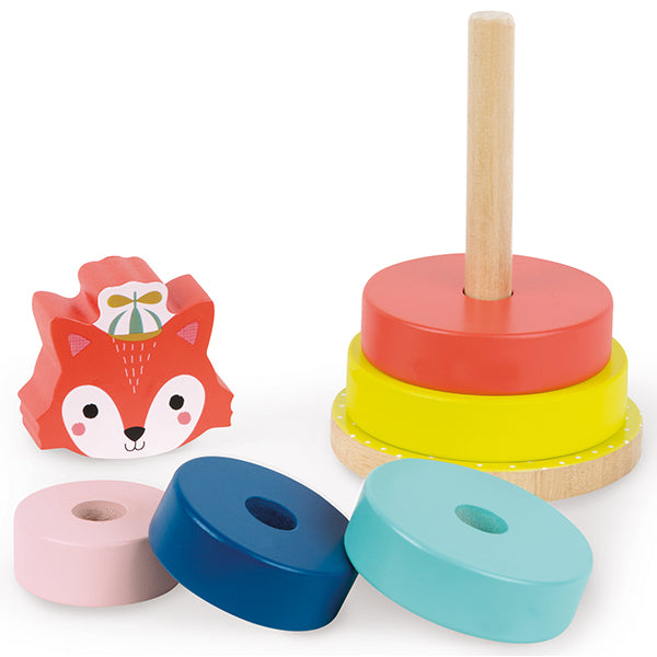 Tour à empiler renard, dimensions : 10 x 10 x 17,5 cm. Votre enfant s'amusera à empiler les 6 anneaux et la tête du renard sur le bâton pour recréer l'animal. Superbe jouet en bois pour la dextérité et joli cadeau de naissance.