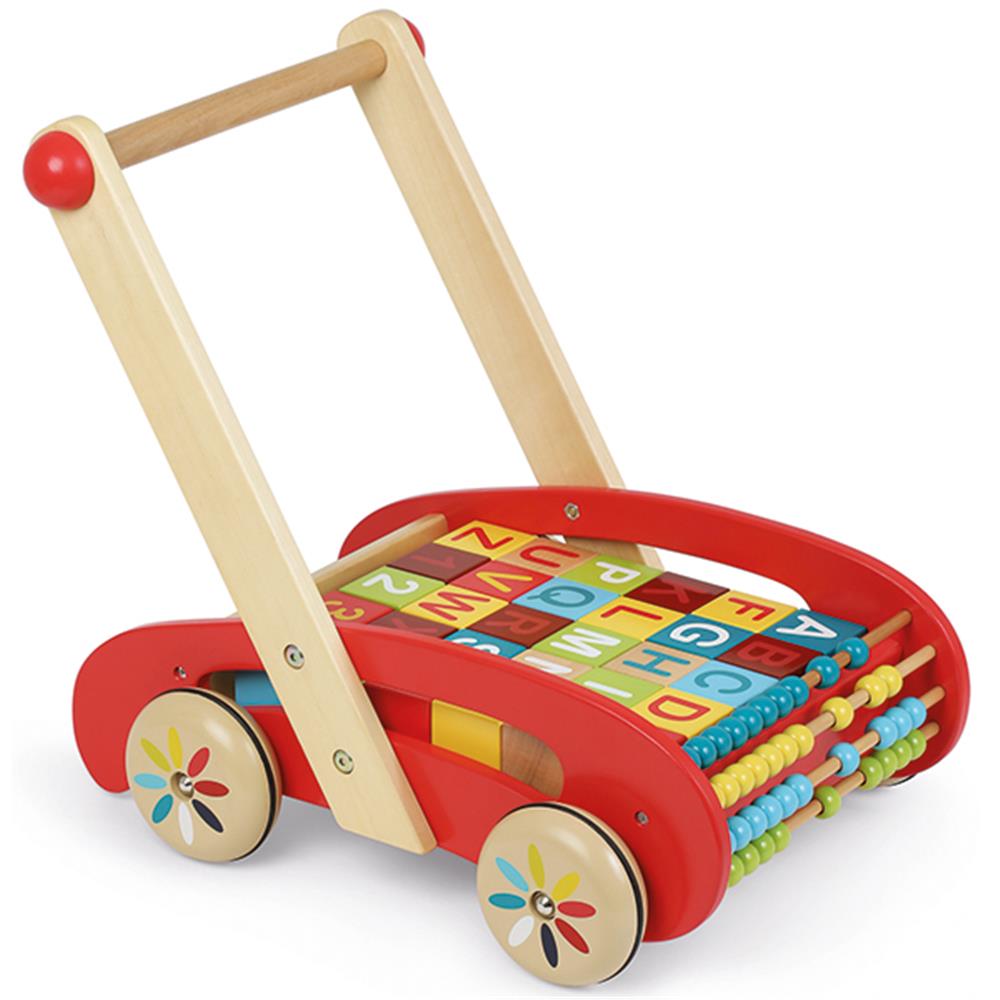Poussette multifonctionnelle pour apprendre les premiers pas, jouer avec des blocs de construction et compter pour la première fois. 30 dés avec lettres majuscules et minuscules et chiffres. Boulier (règle à calcul) pour le premier plaisir de compter. Un jouet riche idéal pour stimuler la motricité et encourager les premières explorations de votre enfant. Un incontournable dans chaque chambre d'enfant.