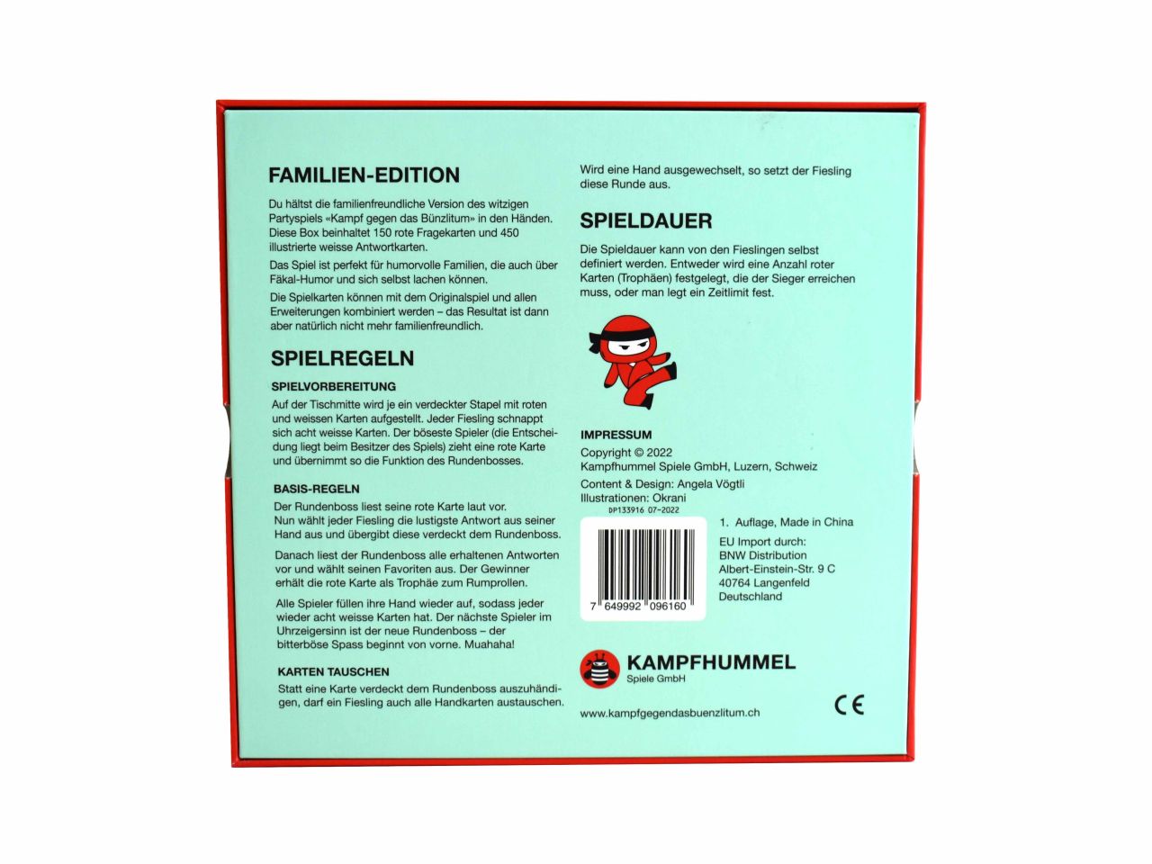 La version familiale du jeu de société suisse « Lutte contre le Bünzlitum ». Comme l'original, cette boîte contient 150 cartes questions rouges et 450 cartes réponses blanches illustrées. Le jeu est parfait pour les familles pleines d'humour qui savent aussi rire d'elles-mêmes.