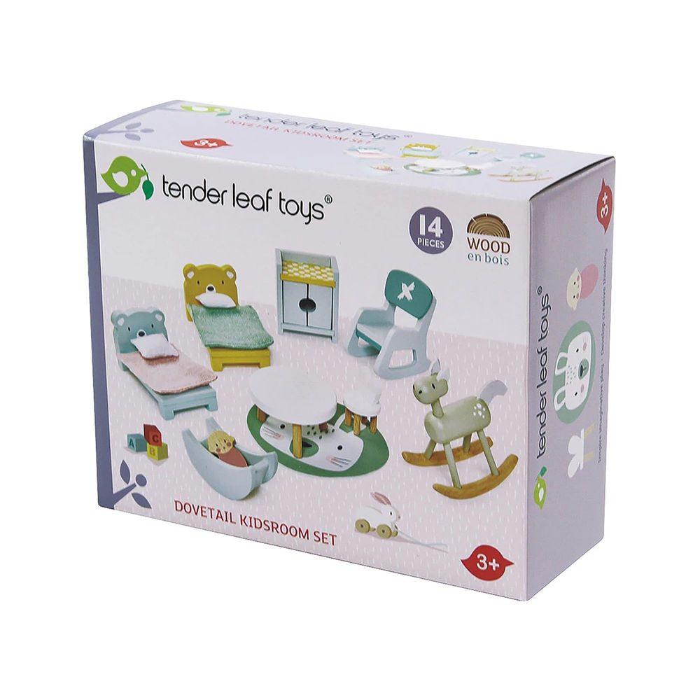Chambre enfant assortie à nos maisons de poupées : table à langer, 2 lits enfants, lit bébé avec bébé, cheval à bascule, tapis, chaise à bascule, table ronde et chaise assortie. Taille du produit : 27x26,5x9,5 cm.
