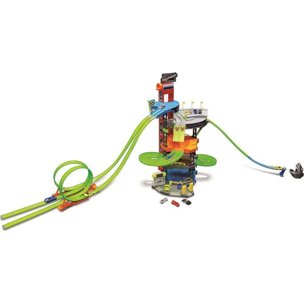 Immense coffret de jeu Maisto avec 4 voitures en zinc moulé, 5 étages, un double ascenseur, une double piste de course, un saut de requin, un lave-auto et bien plus encore.