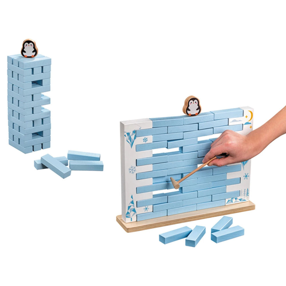 Vous pouvez jouer à ce jeu d'adresse divertissant en deux versions différentes avec 2 à 4 joueurs. Démontez soigneusement les blocs de glace sur le mur de glace avec le pic à glace ou montrez votre tact sur la tour de glace. Ces deux versions passionnantes nécessitent votre habileté, car si le pingouin tombe, le jeu est terminé ! 1ère version : Le Mur de Glace Vous pouvez jouer à ce jeu avec 2 à 4 personnes. Les joueurs tentent à tour de rôle de retirer soigneusement un bloc de glace du mur avec le petit marteau (pic à glace). Les joueurs doivent toujours garder un œil sur le petit pingouin, car s'il tombe du mur, la partie est terminée ! Le joueur qui fait tomber le pingouin perd la partie. 2ème version : La tour de glace : Les joueurs tirent à tour de rôle un bloc de glace hors de la tour avec leurs mains. La même chose s'applique ici : si le pingouin tombe, la partie est terminée et le joueur qui l'a provoqué perd la partie !