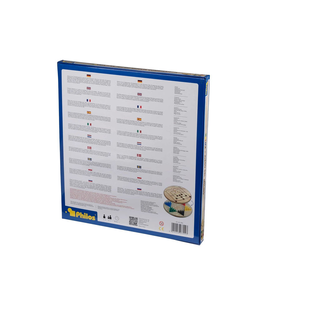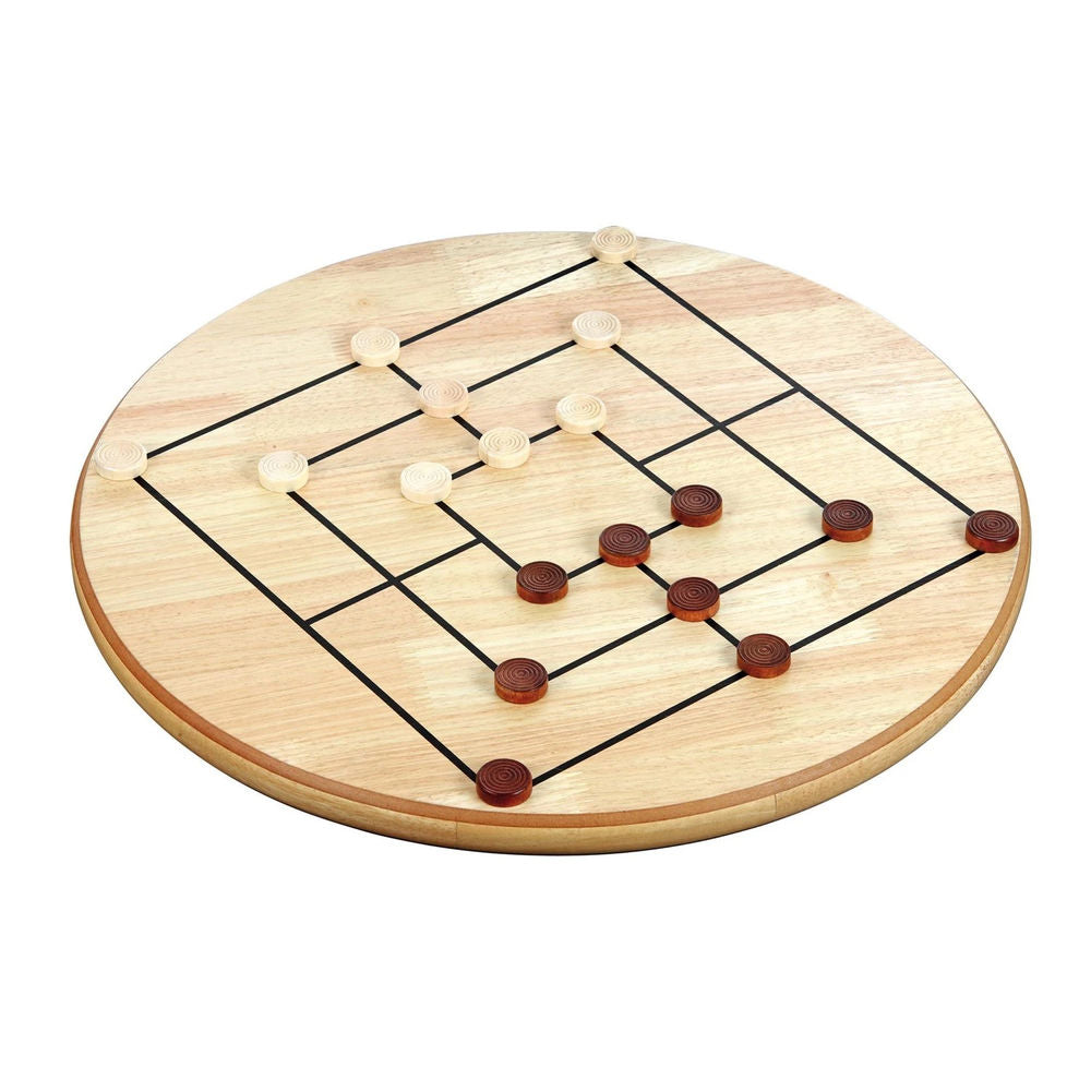 Bois d'hévéa, diamètre 500 mm, imprimé recto-verso. Halma : 60 jetons, bouleau, diamètre 20 mm. Moulin : 18 pièces, bouleau, diamètre 28 mm.