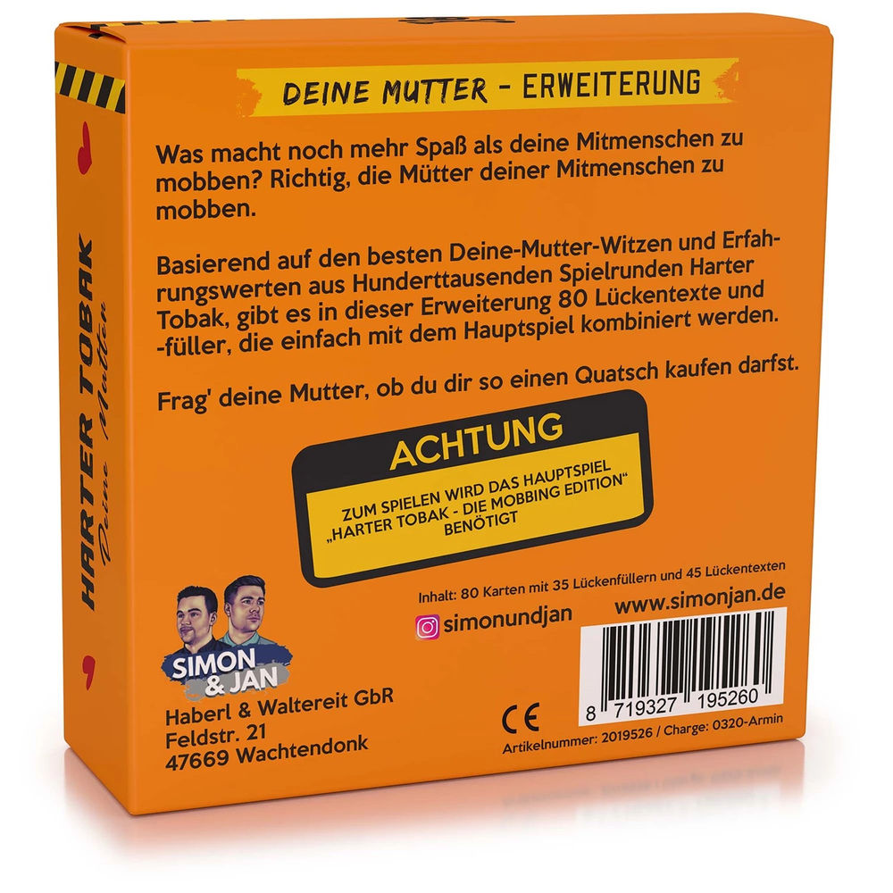 Quoi de plus amusant que d'intimider ses semblables ? C’est vrai, intimider les mères de vos semblables. Basée sur les meilleures blagues de votre mère et sur l'expérience de centaines de milliers de parties de Hard Tobak, cette extension contient 80 textes et remplissages qui sont simplement combinés avec le jeu principal. Demande à ta mère si tu peux acheter des bêtises pareilles.