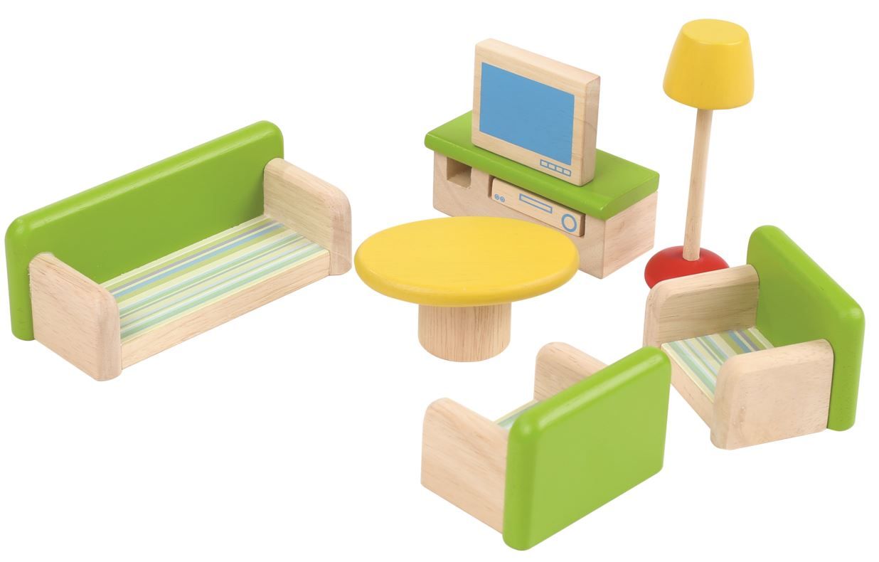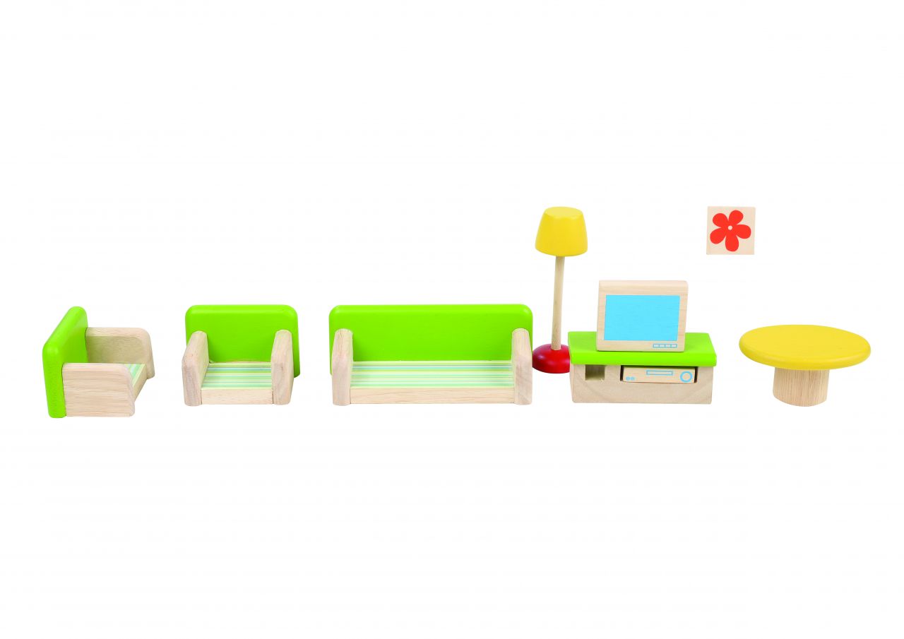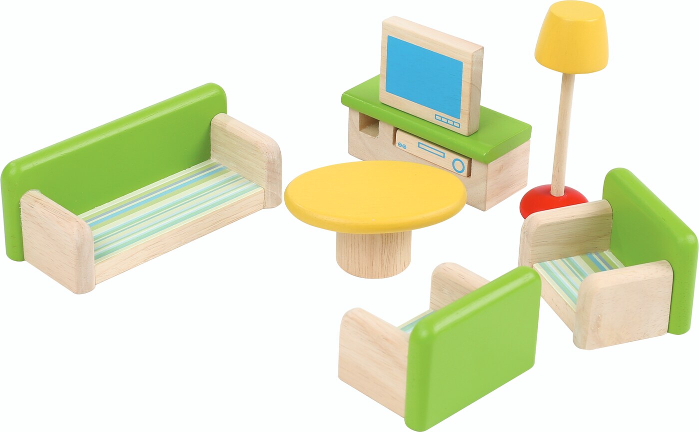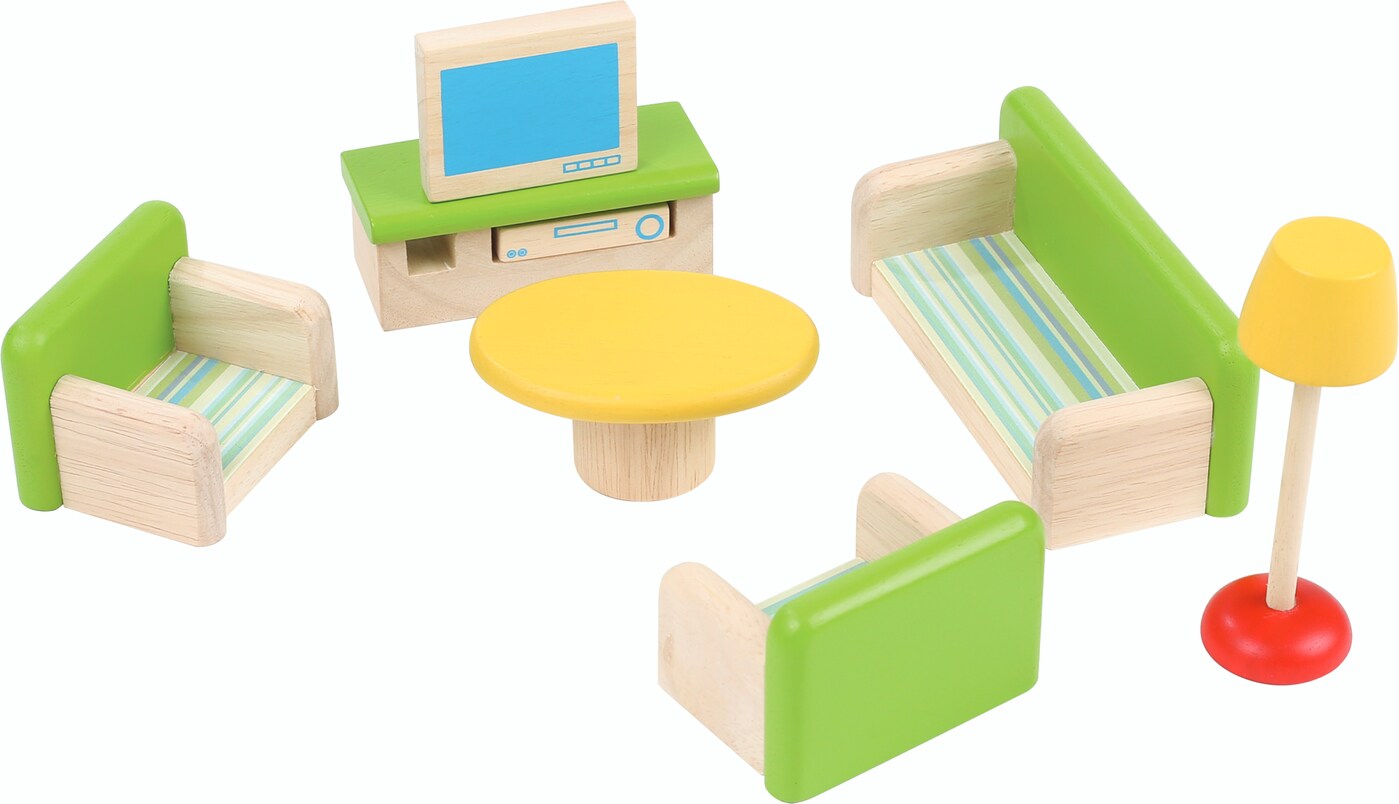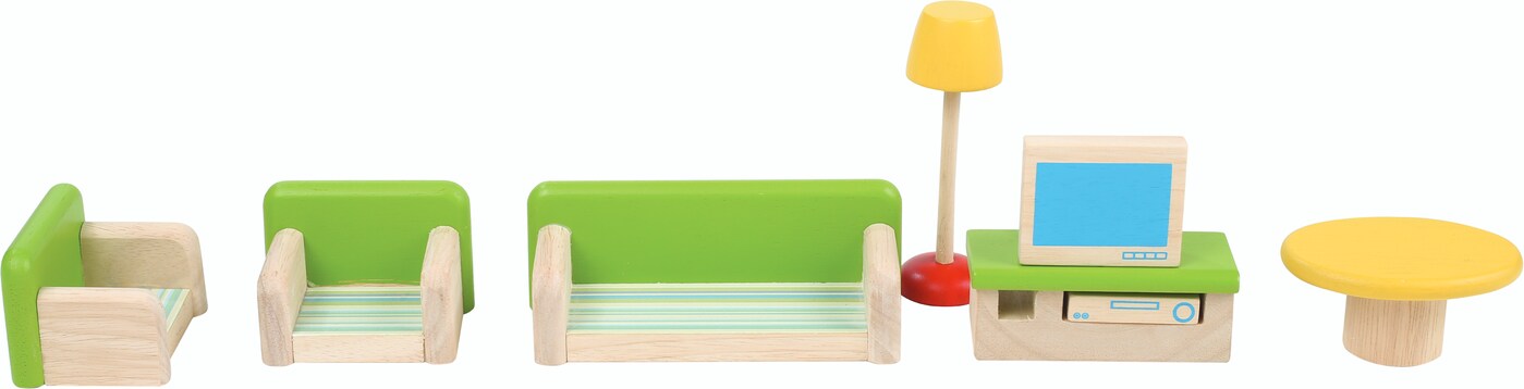 Ce beau salon en bois d'hévéa écologique et de haute qualité contient : un canapé, deux fauteuils, une table basse, un lampadaire et un meuble TV avec télévision. Belle finition et belle peinture. Un enrichissement pour chaque maison de poupée.