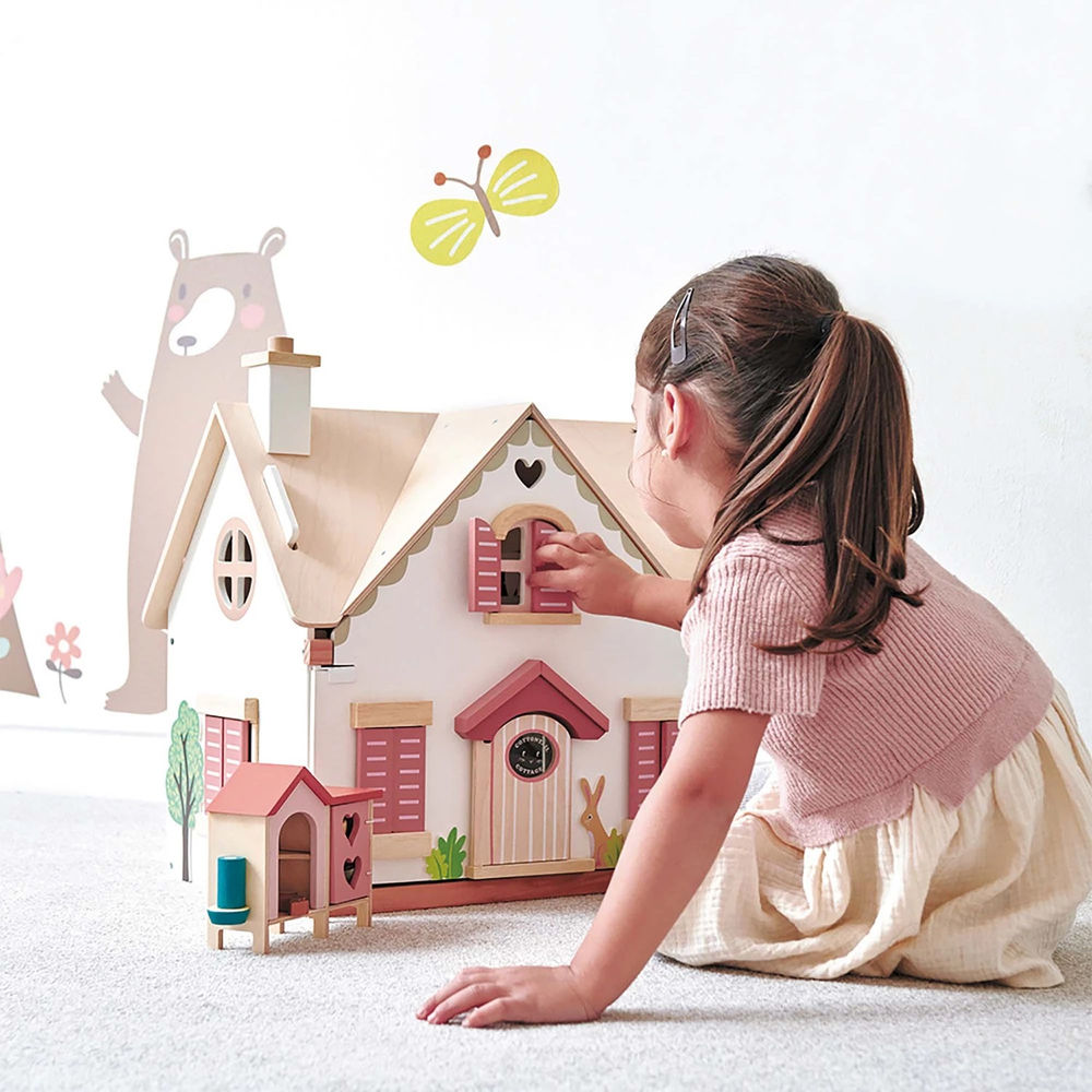 Une maison de poupée dans le style typique d'une maison de campagne avec des meubles assortis - idéale pour les jeux de rôle ! Utilisable sur deux étages, toiture en bois de haute qualité, certifié FSC.