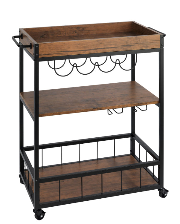 Chariot de cuisine stable à 3 niveaux et 4 roues souples dont 2 freins de stationnement. Le niveau supérieur peut être retiré et utilisé comme plateau. Comprend des bouteilles et des porte-verres.