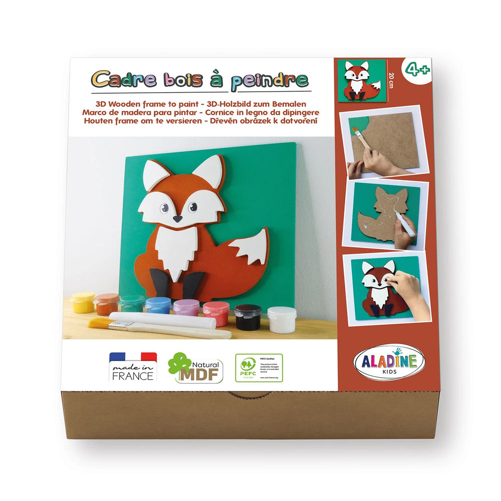 Das neue Aladine Set Fuchs zum Bemalen eines 3D-Holzbildes lässt kreative Kids ab 4 Jahren strahlen. Zur Aufgabe gehört das Bemalen, wie auch das Zusammenkleben der 3D-Formen, dank genauer Anleitung und den vorgefertigten Formen ist dies jedoch kinderleicht. Inhalt: 9-teiliges Holzform-Set Fuchs, 1 Bastelkleber, 1 Pinsel, 8 Farben auf Wasserbasis, 1 Sticker