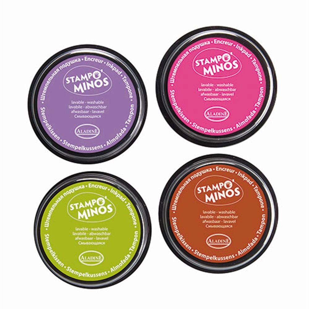 4 verschiedene Farbkissen, um den Stempeln eine fröhliche Farbe zu verleihen. Die Farben sind abwaschbar und trocknen in nur 5 Sekunden.