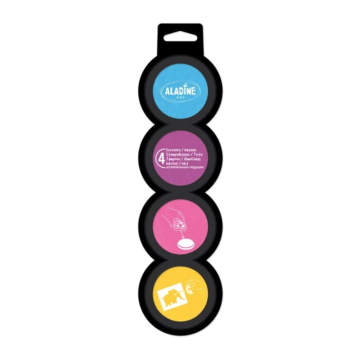 Set mit 4 Kinder Stempelkissen: hellblau/violett/rosa/gelb. Jedes Stempelkissen ist einzeln abtrennbar. Dank der kleinen Einschnitten auf jeder Seite können kleine Kinderhände diese gut halten. Benutzbar mit allen Kinderstempeln und Schablonen. Durchmesser 3.5cm.