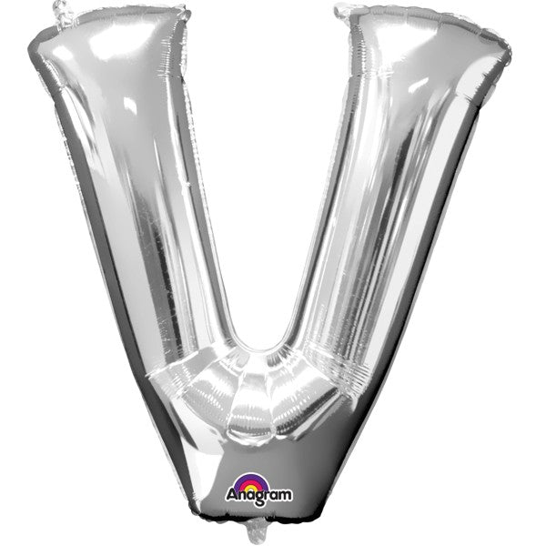 Silbener Folienballon Buchstabe *V* Grösse: 93 x 86 cm. Der ideale Ballon zum Geburtstag, oder zum Jubiläum. Ein strapazierfähiger Folienballon mit einem selbstschliessenden Automatikventil. Der Ballon hat ein Patentventil eingebaut und kann mehrfach aufgeblasen werden.