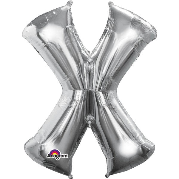 Silbener Folienballon Buchstabe *X* Grösse: 93 x 86 cm. Der ideale Ballon zum Geburtstag, oder zum Jubiläum. Ein strapazierfähiger Folienballon mit einem selbstschliessenden Automatikventil. Der Ballon hat ein Patentventil eingebaut und kann mehrfach aufgeblasen werden.