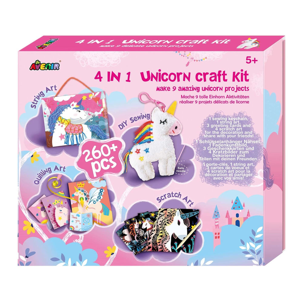 Dieses Kreativ Set enthält 4 verschiedene Bastelaktivitäten zum Thema Einhorn. Das Set ist auch für Anfänger wunderbar geeignet. Es umfasst 1 Schlüsselanhänger Nähset, 1 Fadenkunstbild, 3 Geschenkkarten und 4 Kratzbilder.