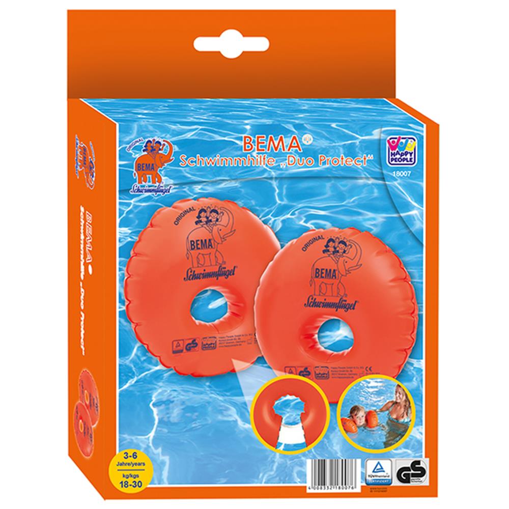 BEMA Schwimmflügel mit integriertem Schaumstoffkern für höchste Sicherheit, sollte die Luft aus den zwei Kammern entweichen halten die zwei Schaumstoffkerne das Kind noch über Wasser. Aufgeblasen haben die BEMA Schwimmflügel eine Grösse von ca. 25 cm im Durchmesser.