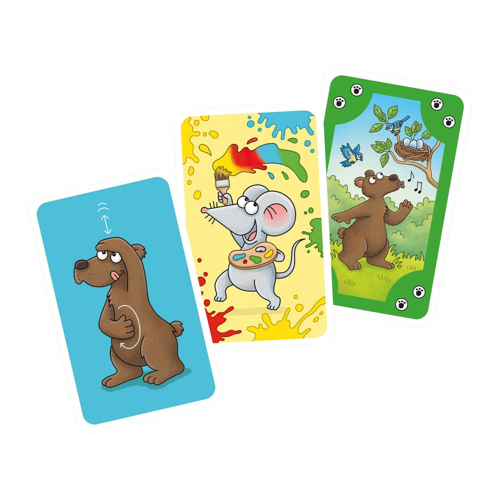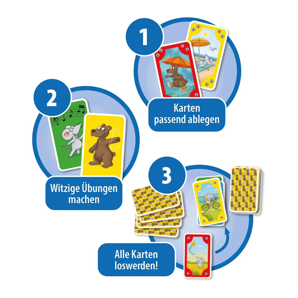 Die Maus Mo und der Bär Bo lieben es, Mau Mau zu spielen. Doch Bo ist das ohne Bewegung etwas zu langweilig. Ob du Grimassen schneidest, singst oder dich verbiegst: Lege möglichst schnell alle deine Karten ab und mache alle Übungen richtig nach, um bei diesem sportlich-spassigen Kartenspiel zu gewinnen.