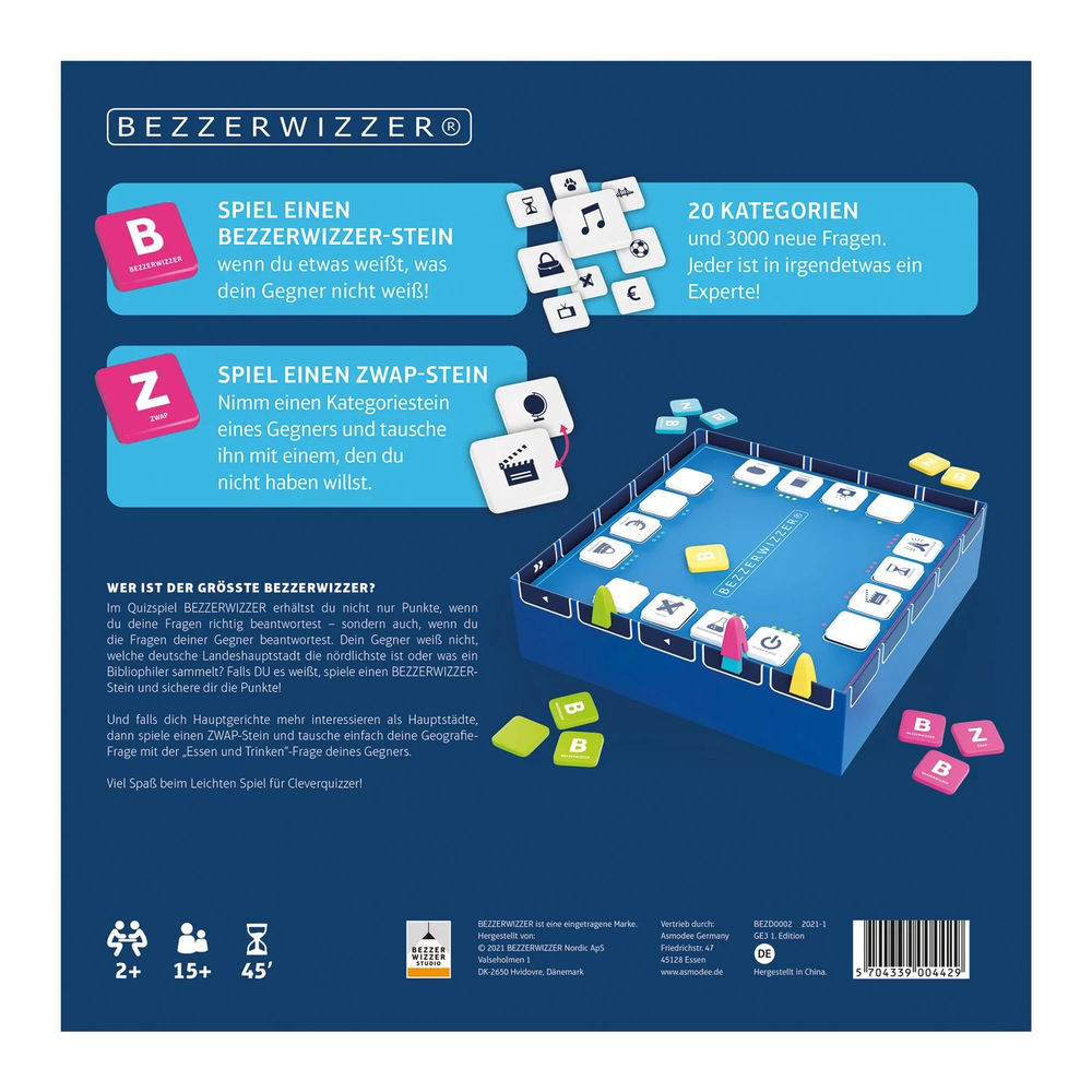 BEZZERWIZZER ist das beliebteste Spiel in Skandinavien und wurde bereits mehr als 2 Millionen Mal weltweit verkauft. Beantwortet in Teams – wobei Teams aus einem oder mehreren Spielern bestehen können – Fragen aus 20 Kategorien über mehrere Runden. In jeder Runde erhält jedes Team vier Kategorien, aus denen Fragen beantwortet werden. Je nachdem auf welchem Feld eine Kategorie liegt, gibt die richtige Antwort ein bis vier Punkte. Wählt also weise, auf welches Feld ihr eine Kategorie legt. Im Quizspiel BEZZERWIZZER erhaltet ihr nicht nur Punkte, wenn ihr eure eigenen Fragen richtig beantwortet – sondern auch, wenn ihr die Fragen eurer Gegner beantwortet. Euer Gegner weiß nicht, welche deutsche Landeshauptstadt die nördlichste ist oder was ein Bibliophiler sammelt? Falls ihr es wisst, spielt einen BEZZERWIZZER-Stein und sichert euch die Punkte. Und falls euch Hauptgerichte mehr interessieren als Hauptstädte, dann spielt einen ZWAP-Stein und tauscht einfach eure Geografie-Frage mit der „Essen und Trinken“-Frage eures Gegners. Das Team, das als erstes das Ziel erreicht, gewinnt.