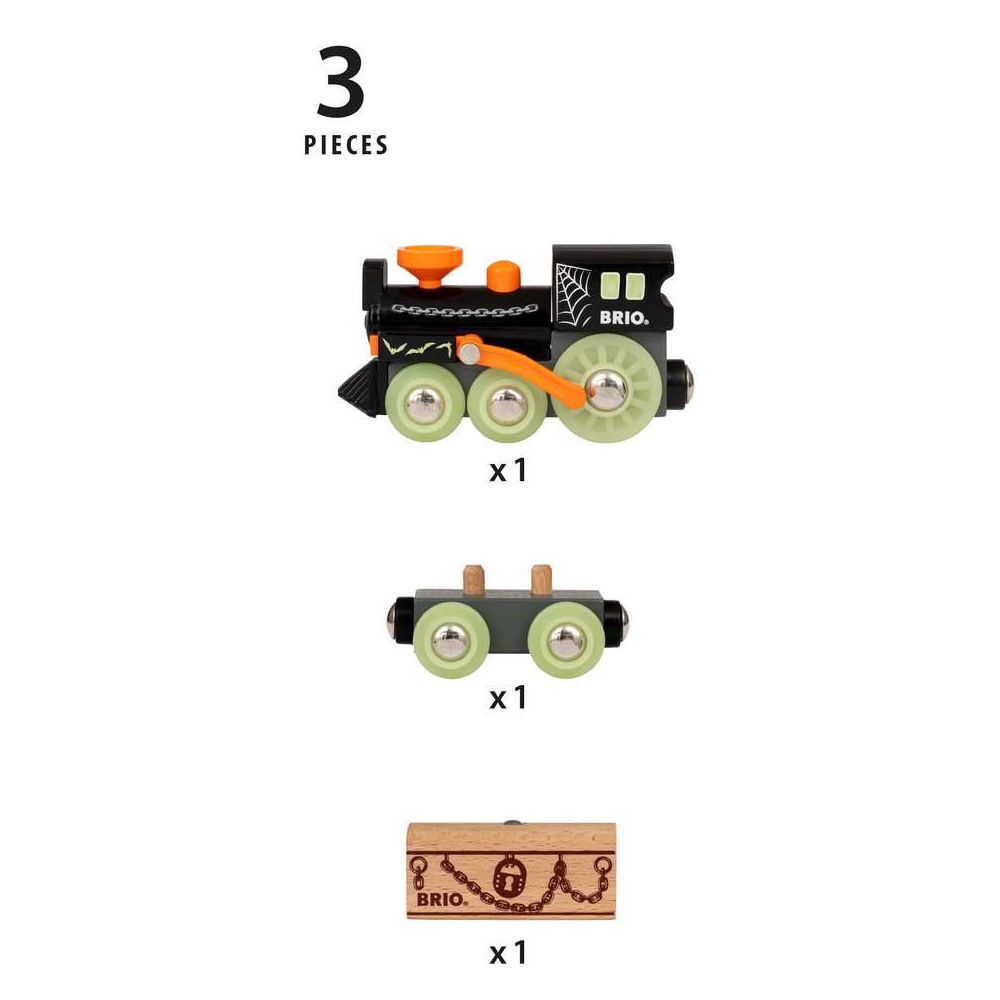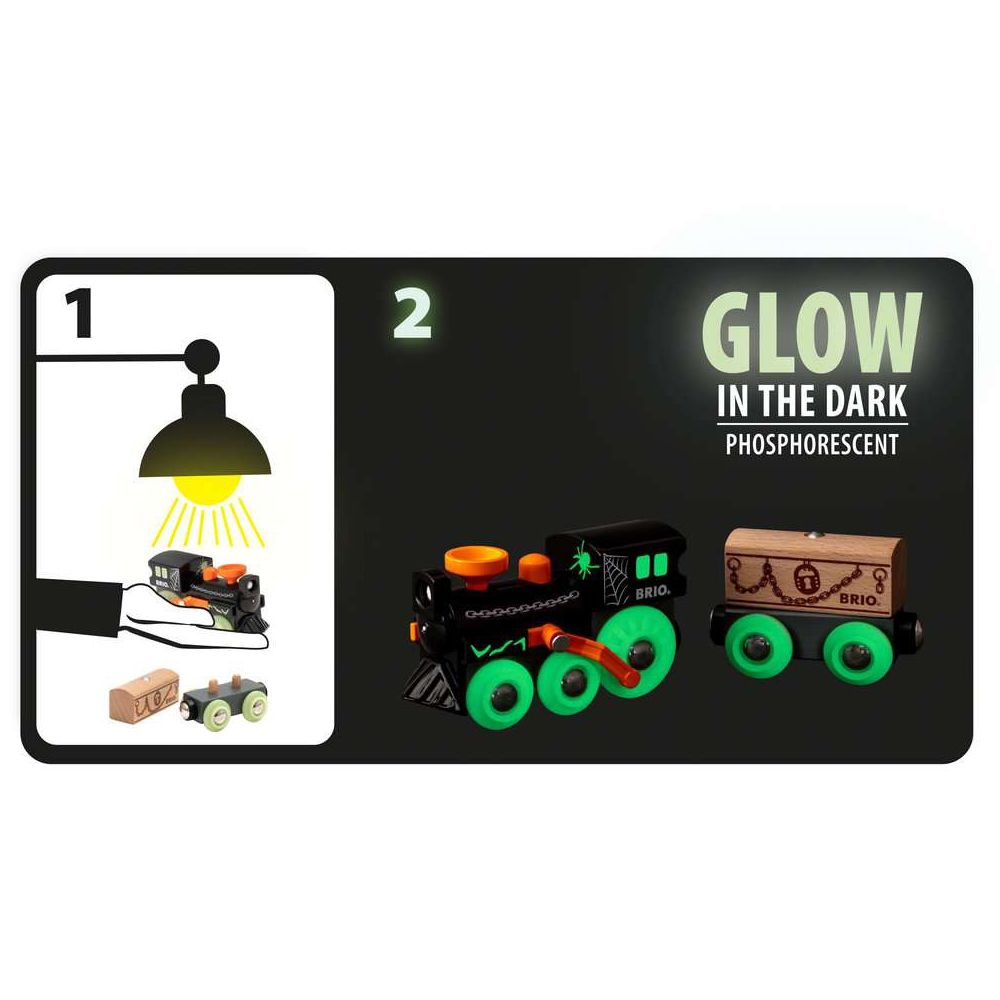 Huh-huh-huuuh! Etwas Unheimliches kriecht die Schienen entlang. Der Geisterzug leuchtet im Dunkeln und hat eine Holzkassette im Schlepptau – was da wohl drin ist? Mit den bekannten BRIO Magnetverbindungen kann diese gespenstische Dampflok mit allen anderen Loks und Waggons verbunden werden und die BRIO World erschrecken.