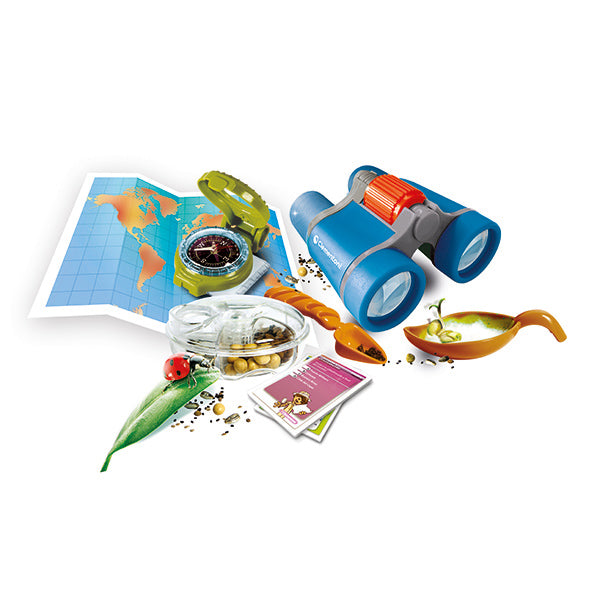 Auf den Spuren der Natur. Ein Multi-Aktivitäts-Set für Outdoor-Spass und für Kinder, die neugierig auf die Welt und ihre Umgebung sind. Das Spiel enthält ein Fernglas, einen Kompass und andere Hilfsmittel für kleine Entdecker, die gerne Zeit an der frischen Luft verbringen. Die Karten und ein Poster über die Natur bieten den Kindern viele interessante Einblicke und lehren sie neue Begriffe.