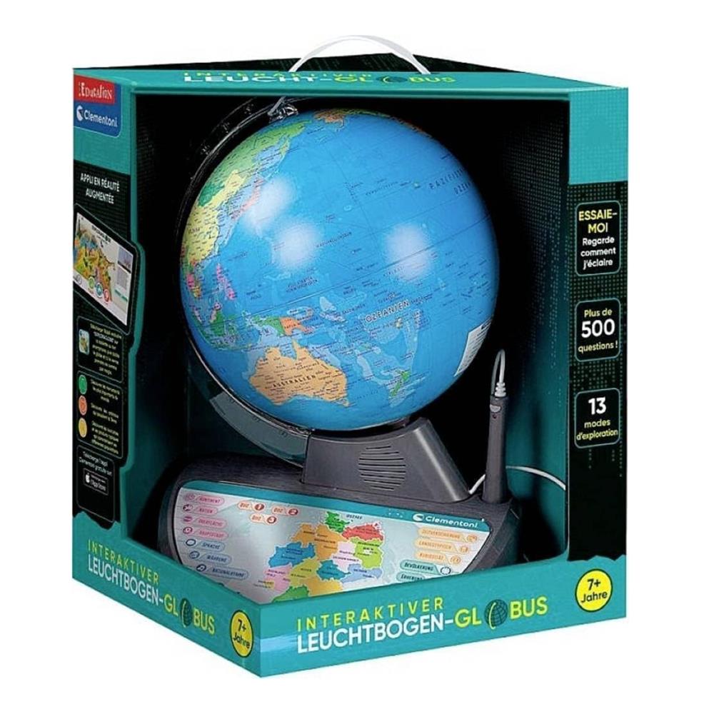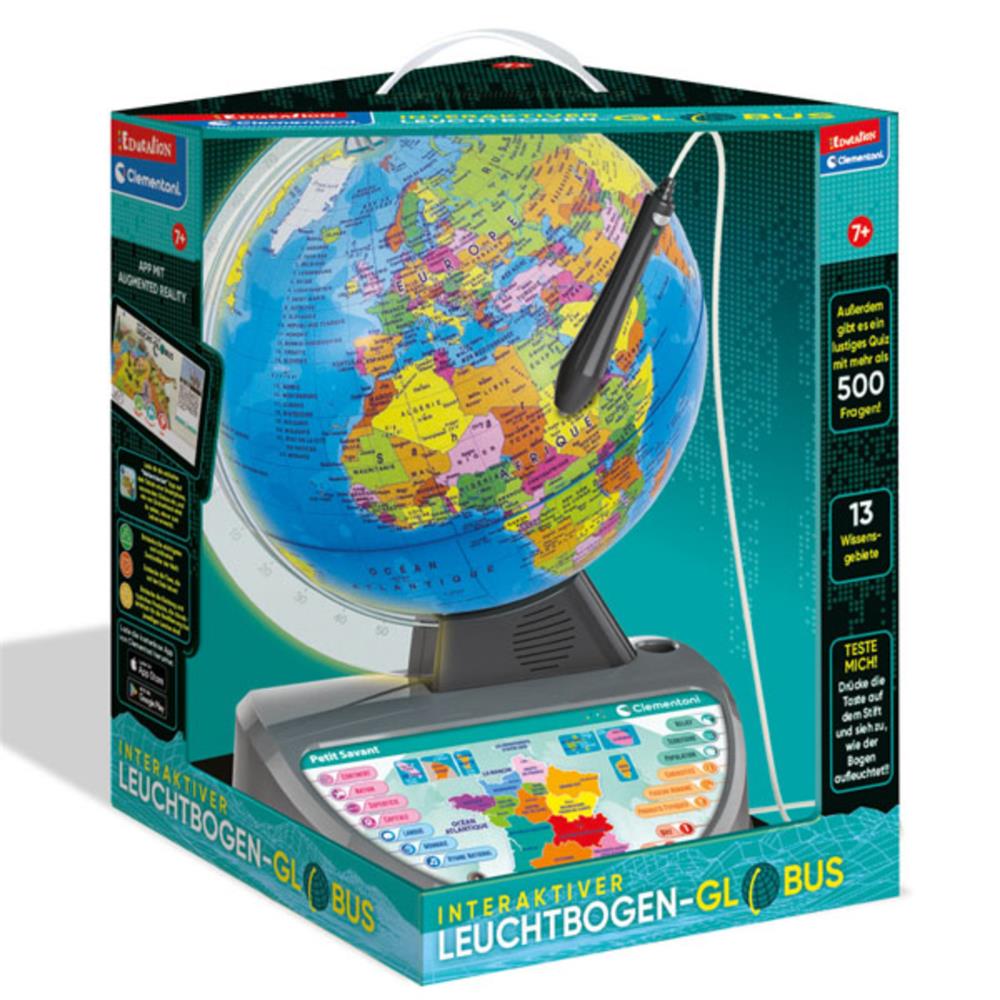 Interaktiver Leuchtbogen Globus. Ein völlig neues Design für diese schöne interaktive Weltkarte mit optischem Stift. Der transparente Bogen leuchtet auf, wenn der Globus an ist! Kinder können die Welt entdecken und mehr über Kontinente, Länder, Hauptstädte, Oberflächen, Bevölkerungsgruppen, Währungen, Sprachen, Gebiete, Höhen, Zeitunterschiede und weitere interessante Fakten erfahren. Mit mehr als 500 Fragen in 3 verschiedenen Schwierigkeitsstufen kann man das erworbene Wissen testen. Das Lernen wird dank des neuen Designs, der hervorragenden Audioqualität und mehr als 3 Stunden informativer Audioinhalte, interessanter Fakten und Musik aus der ganzen Welt einfach faszinierend. Dank der neuen kostenfreien App erfahren Kinder ein erhöhtes Realitäts- Erlebnis. Wenn die Weltkarte durch ein Tablet oder Smartphone betrachtet wird, kann das Kind Tiere, Denkmäler und verschiedene Kulturen sehen.