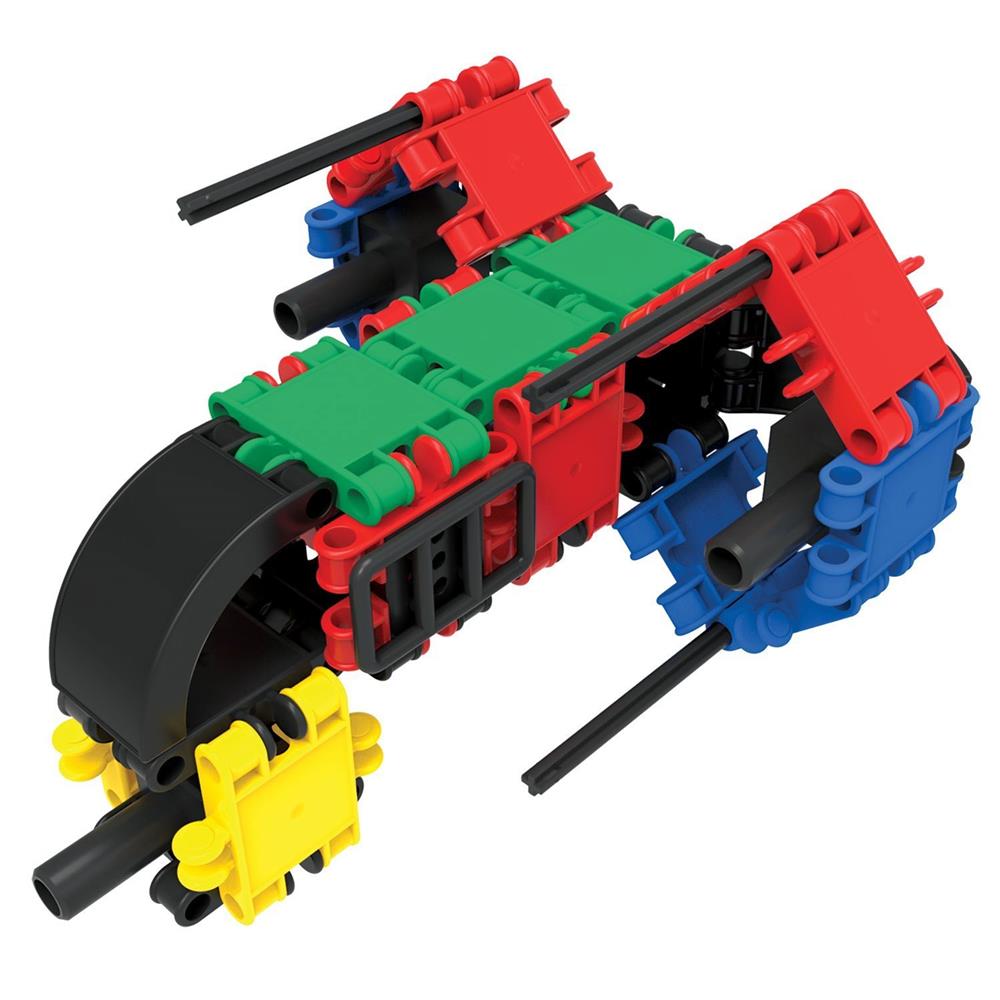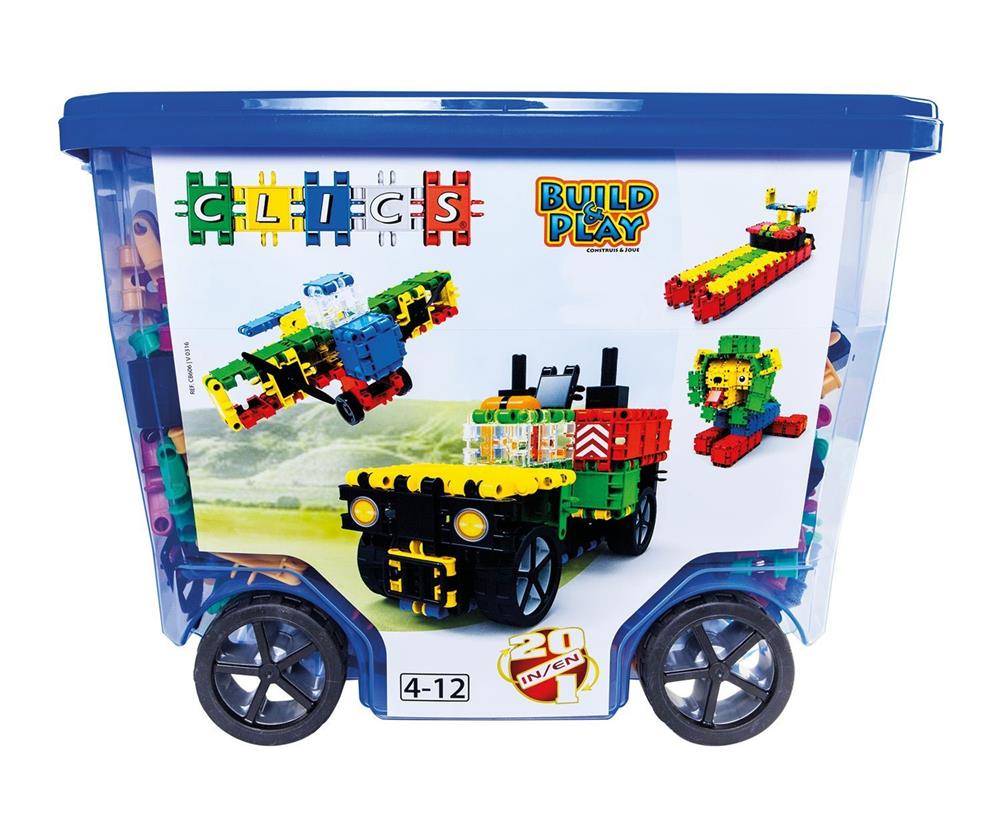 Rollbox 575 Teile - 463 Clics + 97 Zubehör + Stickers + Kartenset. Die Räder können für einen Rennwagen, einen Buggy, einen Traktor oder andere 15 tolle Konstruktionen benutzt werden.