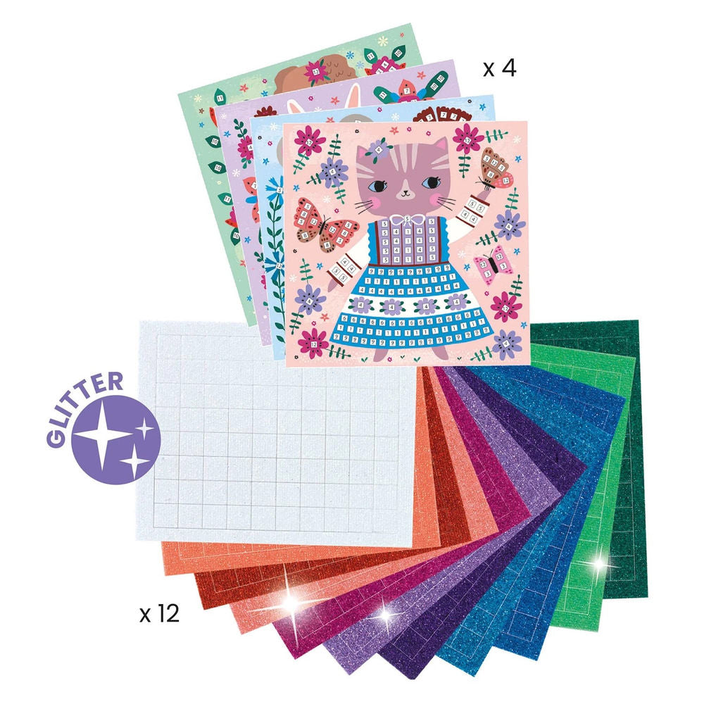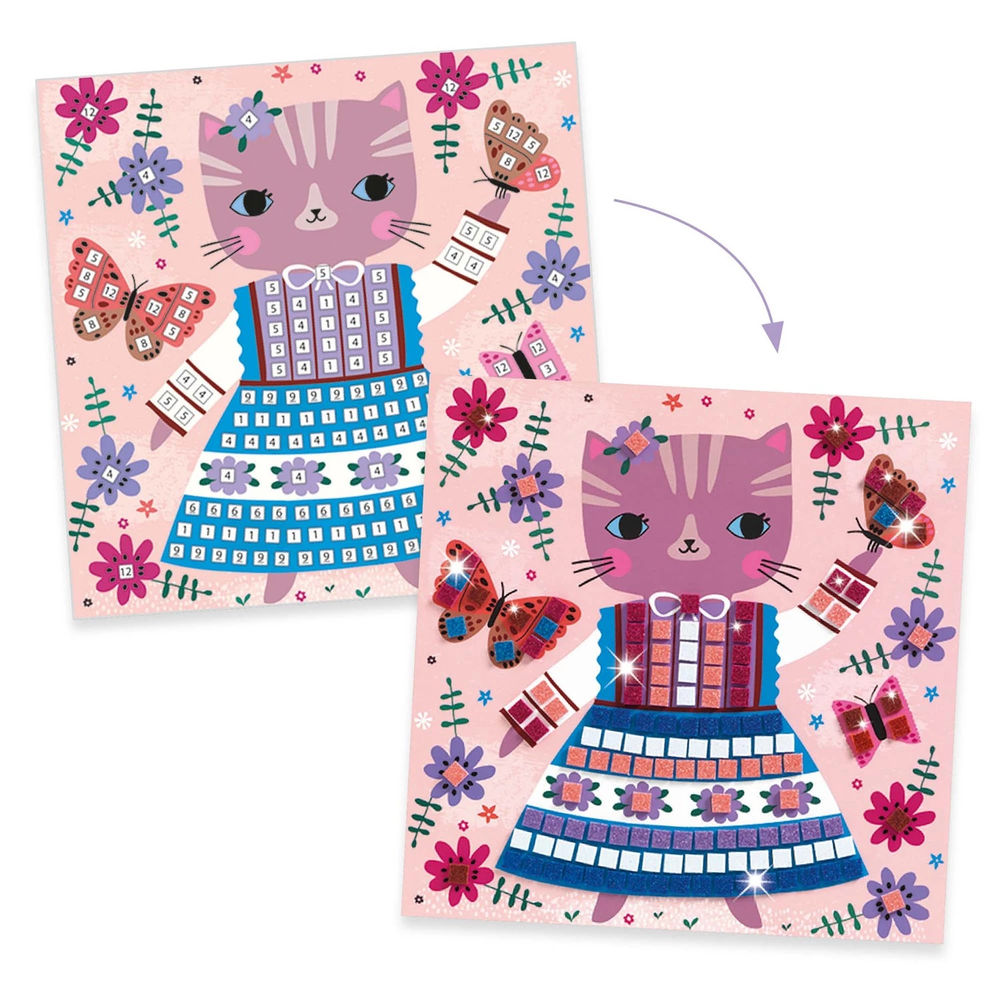 Eine Box, um die Kunst des Mosaiks zu lernen, indem man die Outfits dieser liebenswerten Charaktere verschönert. 4 Bilder zum Vervollständigen mit kleinen Quadraten aus Moosgummi, die einfach aufgeklebt werden. Das Kind sucht die Zahlen und klebt die entsprechenden Teile an die vorgesehene Stelle im Bild. Die Bilder füllen sich und die Figuren erwachen zum Leben.