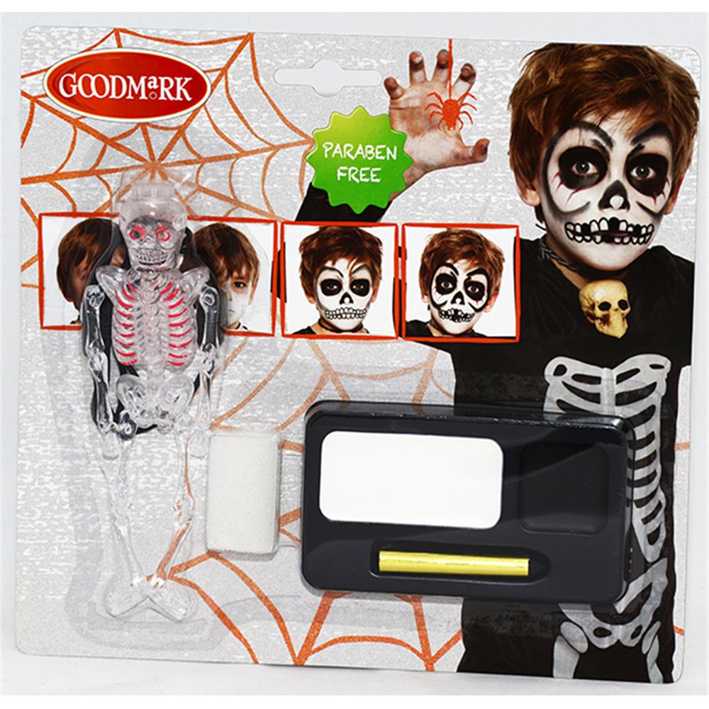 Schminkset Skelett: inkl. weisse und schwarze Gesichtsschminke, schwarzer Schminkstift, Schwamm und Skeletthalskette. Damit verwandelst du dich in ein gruseliges Skelett.