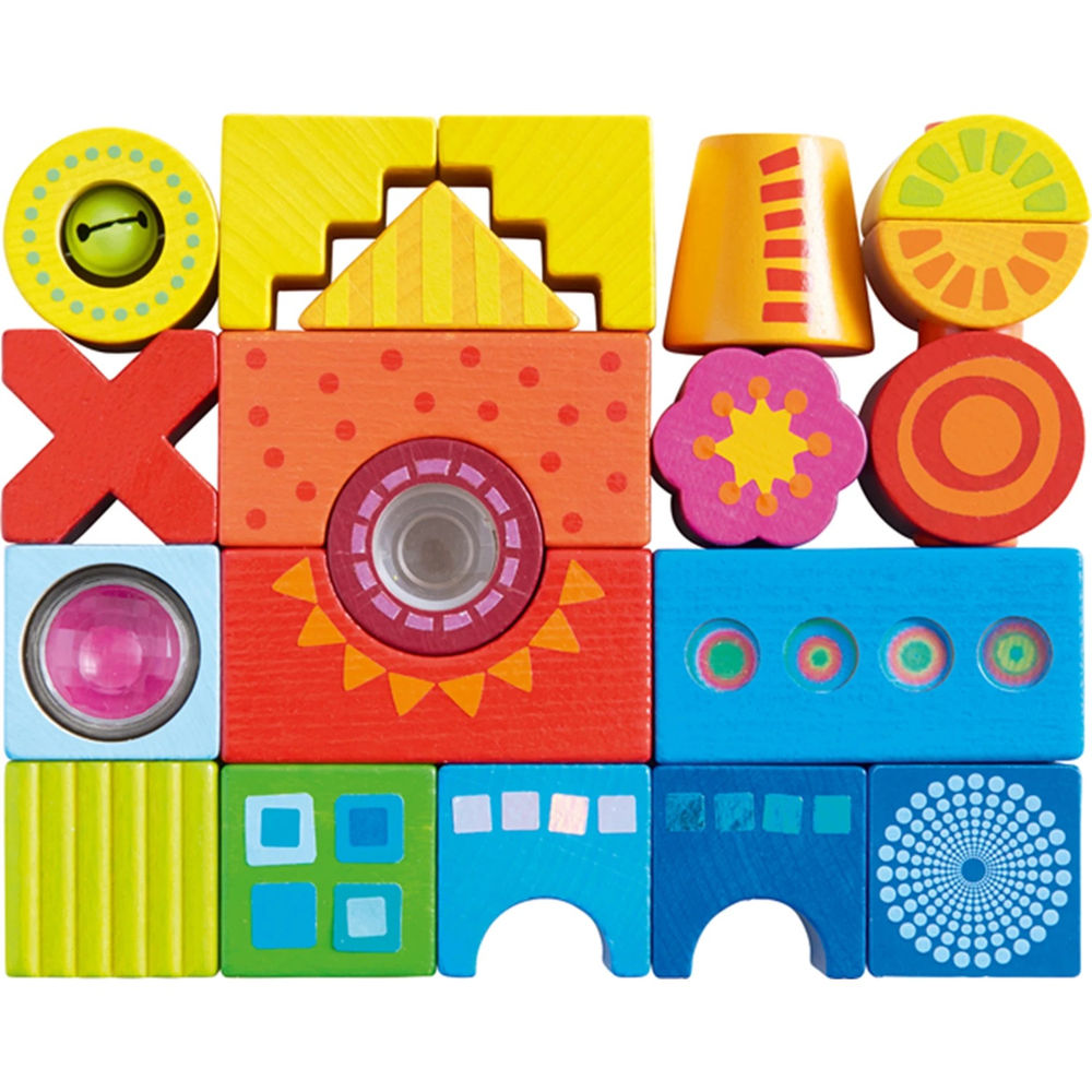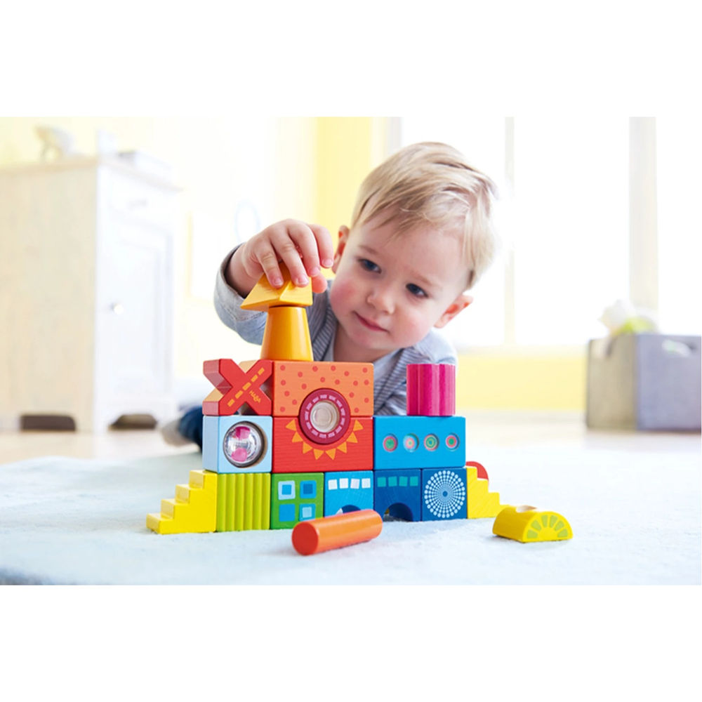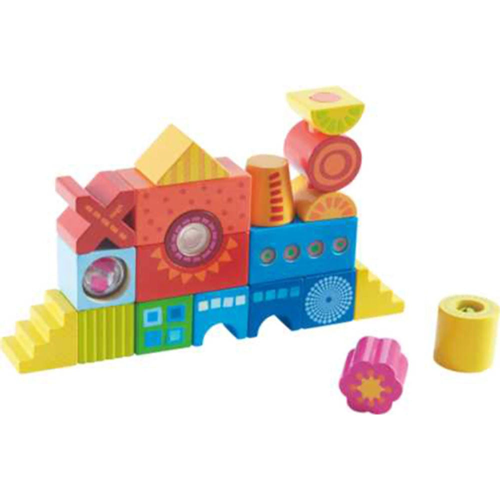 Mit diesen farbenfrohen Bausteinen können Kinder viele tolle Türme stapeln. Die unterschiedlichen Effekte – Glöckchen, Durchguck, Klapperkugel – sind für kleine Weltentdecker genau das Richtige und regen alle Sinne an.