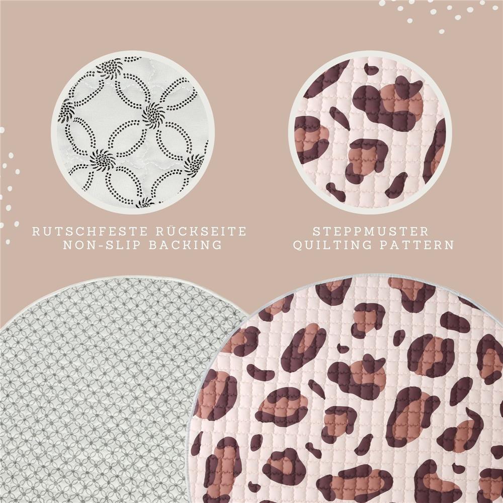 Die Babykrabbeldecke im Wild Cat Natural Design, verschönert stilvoll Ihre Einrichtung im Wohn- oder Kinderzimmer und erfreut gleichzeitig Ihr Baby. Die schönen, sanften Pastellfarben der Krabbelmatte fügen sich perfekt in Ihre Inneneinrichtung ein und geben ein Gefühl von Harmonie und Komfort. Mit grosszügigem 150 cm Durchmesser und 1,5 cm Stärke bietet die gesteppte Decke ausgiebig Platz zum Krabbeln und Spielen für Yoga - und Sportübungen oder Picknicks im Freien. Die Kinder Spielmatte ist einfach zu reinigen und für 30°C Maschinenwäsche geeignet. Gumminoppen auf der Rückseite der Babymatte sorgen für einen rutschfesten Spiel- und Krabbelspass, dank der guten Haftung der Spieldecke auf dem Boden schützt diese Ihr Baby beim Hinfallen. Die Kinderspielmatte besteht aus weichem, hautfreundlichem Polyestergewebe das Material entspricht den REACH-Standards und erfüllt ausserdem alle EU - Produktsicherheitsstandards. Die Decke wird vakuumversiegelt geliefert. Das spart Platz und reduziert CO2-Emissionen während des Transports.