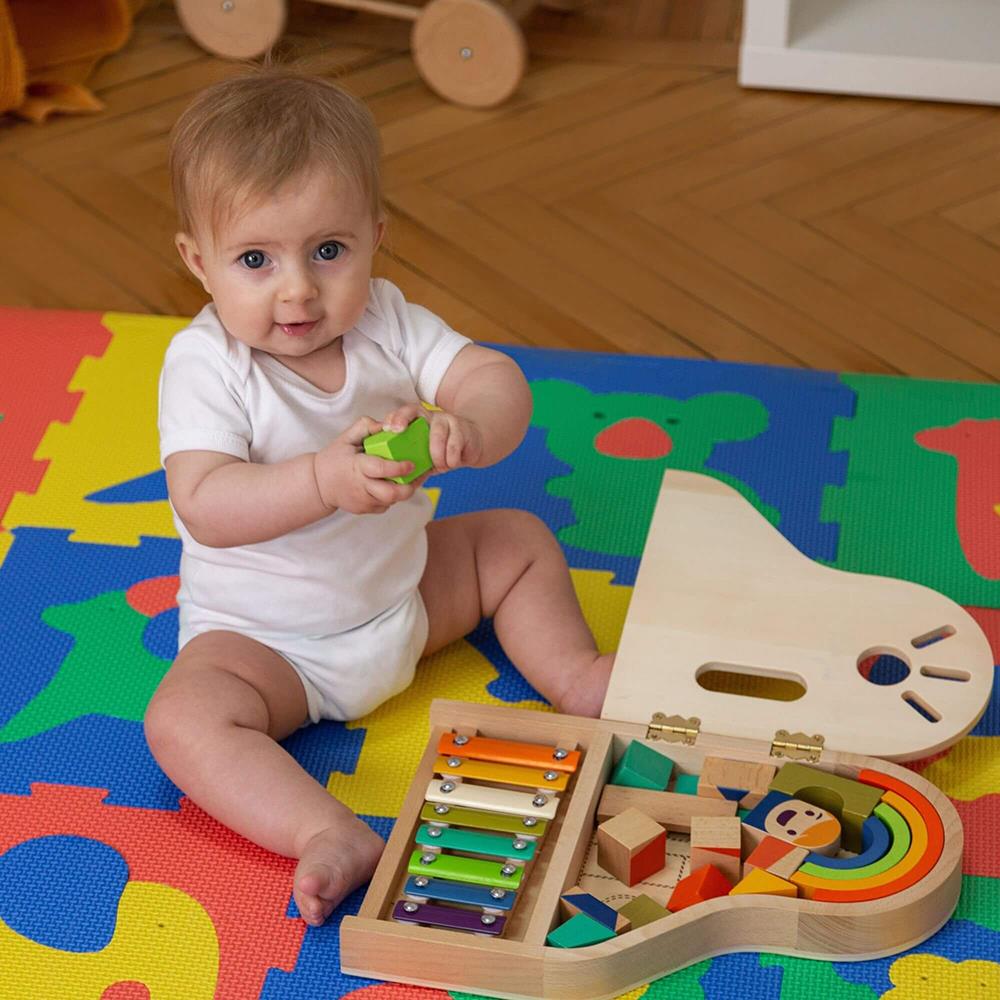 Die «Safari Tiere» Puzzlematte von Hakuna Matte bietet Deinem Kind nicht nur angenehmen Schutz beim Spielen am Boden, sondern hilft auch, Farben und Formen kennen zu lernen. Die spielerischen Tierpuzzles in schönen, kindgerechten Farben fördern die Entwicklung der motorischen Fähigkeiten und des Problemlösungsvermögens und verleihen Deinem Zuhause eine farbenfrohe fröhliche Atmosphäre. Die im Lieferumfang enthaltenen Abschlusskanten sorgen für eine cleane Optik. Aus den Puzzleelementen ist es zusätzlich möglich, kreative Objekte zu bauen. Dafür werden die Elemente einfach winklig zusammengefügt. Die Puzzleteile haften, wenn sie nass werden an der Badewanne oder an Fliesen und beschäftigen Dein Kind während des Badens. Hilf deinem Kind die Welt zu entdecken - egal ob beim Zusammensetzen der zweidimensionalen Matte oder beim Bauen eines dreidimensionalen Hauses. Materialien, welche frei von Chemikalien wie BPA und Phthalaten sind, machen die Matte für Dein Kind absolut sicher.