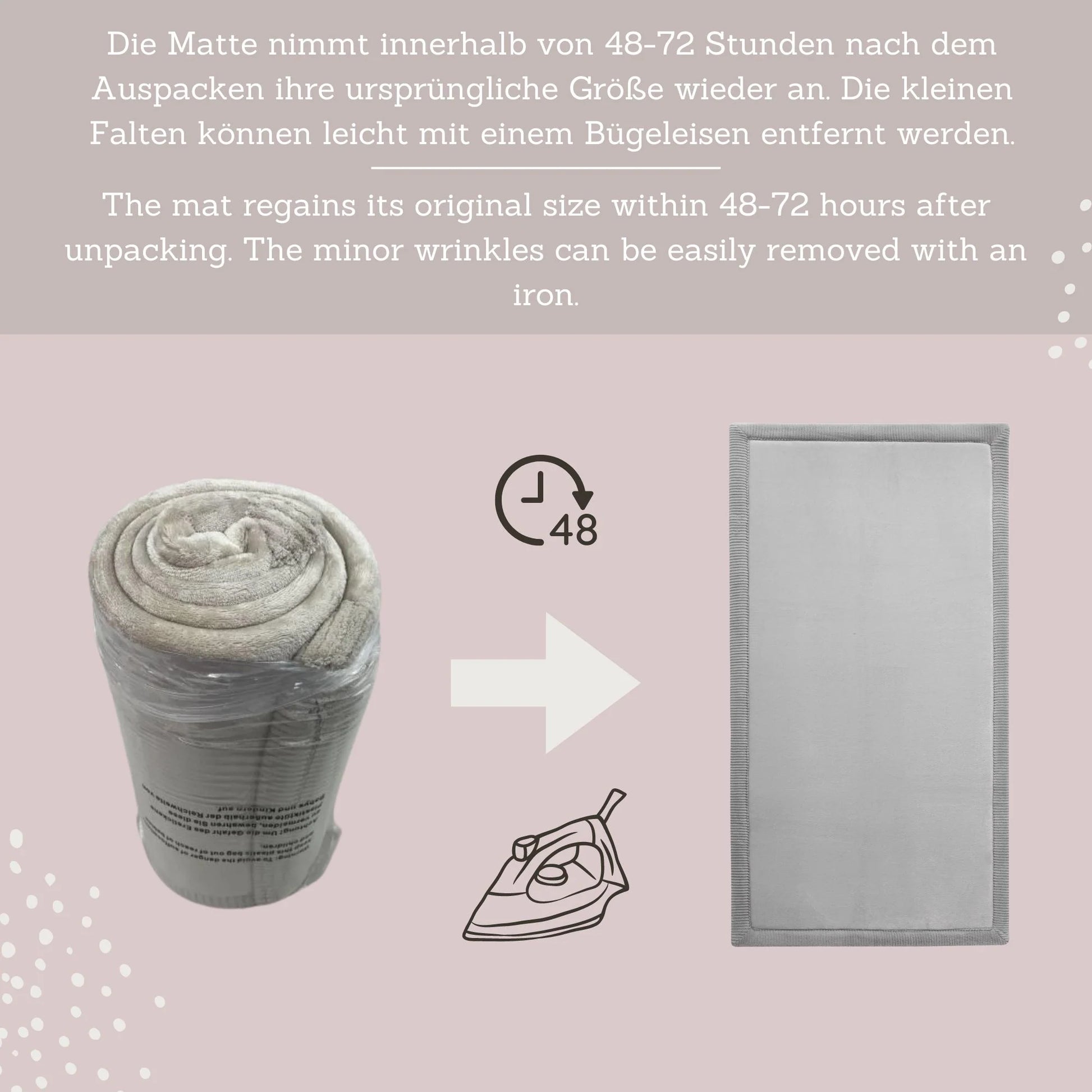 PREMIUM MEMORY-SCHAUM ist 2 cm dick und nimmt seine Grösse im Vergleich zu billigeren Alternativen schneller wieder an (innerhalb von 1-2 Tagen). Der Kinderteppich wird als Decke gefaltet geliefert und muss im Gegensatz zu vakuumverpackten Teppichen nicht gebügelt werden. Die komprimierte Verpackung spart Platz beim Transport und senkt die Kohlenstoffemissionen.