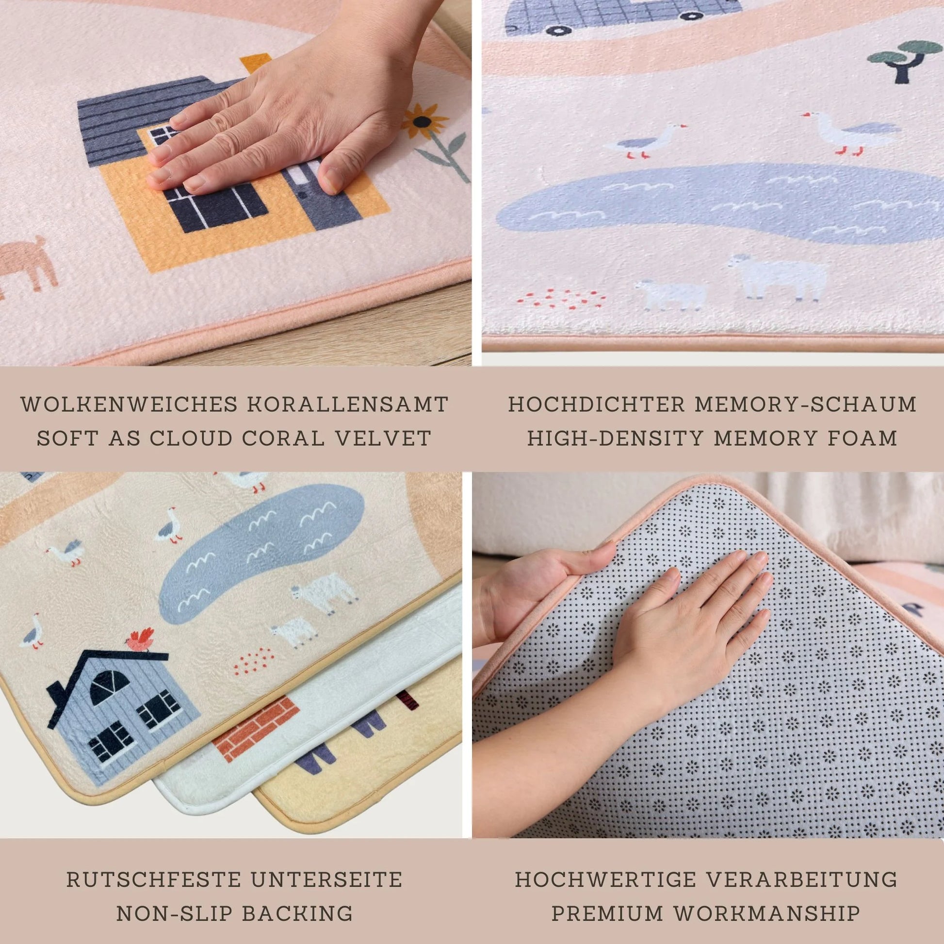 - Der wolkenweiche Spielteppich für Kinder besteht aus drei Schichten: 1. Korallensamt für den weichsten Hautkontakt, 2. elastischer Memory-Schaum für bequemes Spielen und Krabbeln, 3. rutschfeste Rückseite zum Schutz vor Stössen beim Fallen. Durch die extra Grösse von 160 x 120 x 1,5 cm ist dieser Baby Teppich perfekt zum Krabbeln, Spielen, und Yoga.