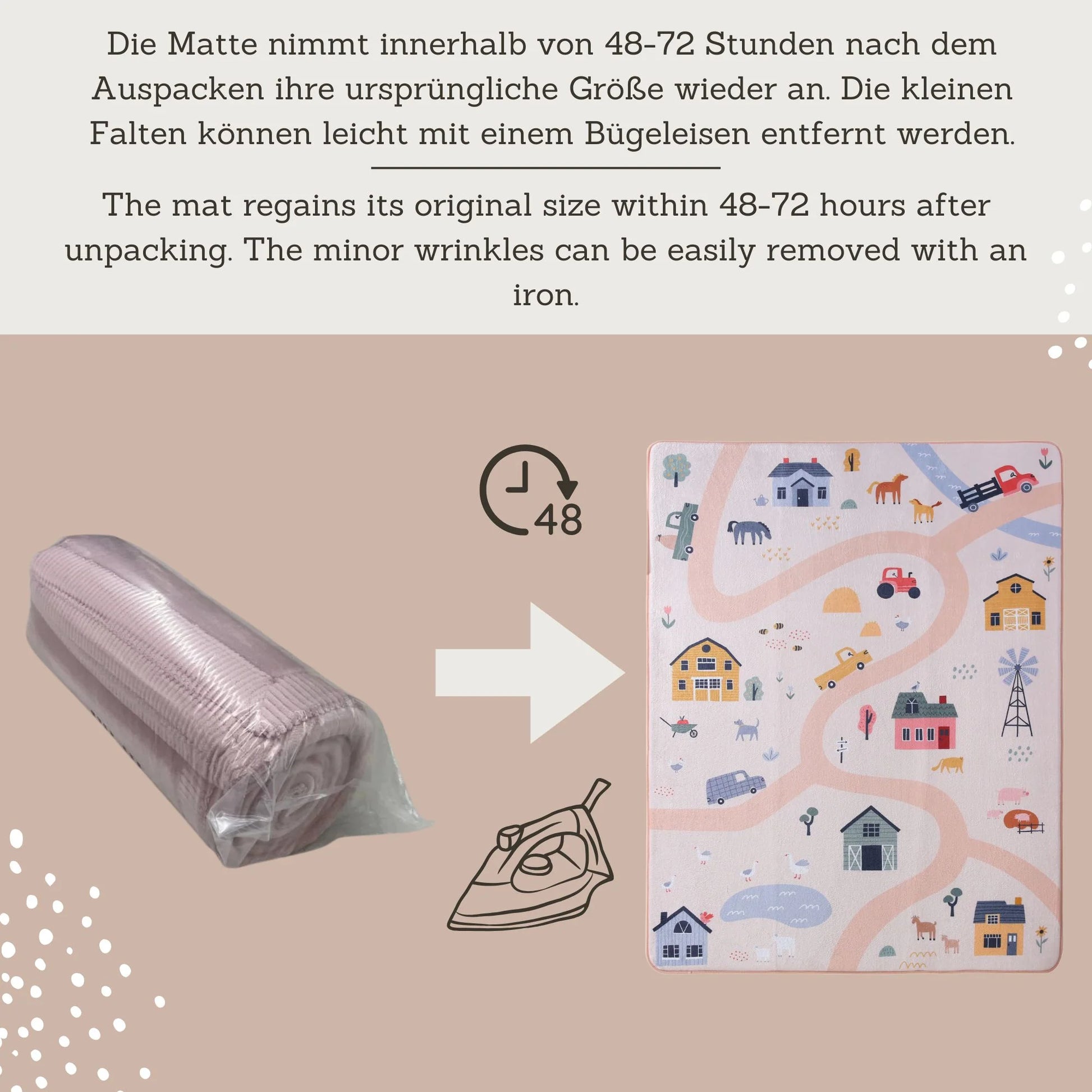 - Premium Memory-Schaum ist 1 cm dick und nimmt seine Grösse im Vergleich zu billigeren Alternativen schneller wieder an (innerhalb von 1-2 Tagen). Der Spielteppich für Babys wird als Decke gefaltet geliefert und muss im Gegensatz zu vakuumverpackten Krabbelteppichen für Babys nicht gebügelt werden. Die komprimierte Verpackung spart Platz beim Transport und senkt die Kohlenstoffemissionen.