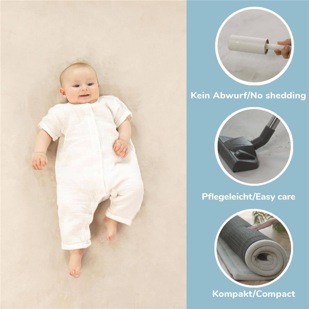 DER WOLKENWEICHE KINDERTEPPICH besteht aus drei Schichten: 1. Korallensamt für den weichsten Hautkontakt, 2. elastischer Memory-Schaum für bequemes Spielen und Krabbeln, 3. rutschfeste Rückseite zum Schutz vor Stössen beim Fallen. Durch die extra Grösse von 200 x 150 x 2 cm ist diese faltbare Spielmatte perfekt zum Krabbeln, Spielen, Yoga und für die Fitness zu Hause.
