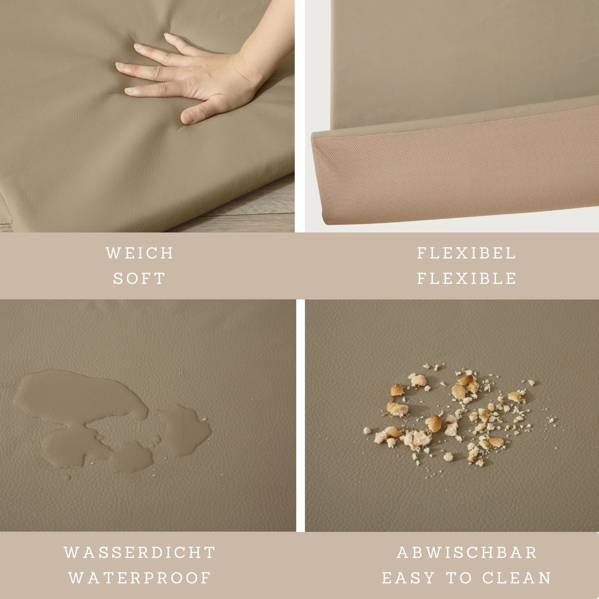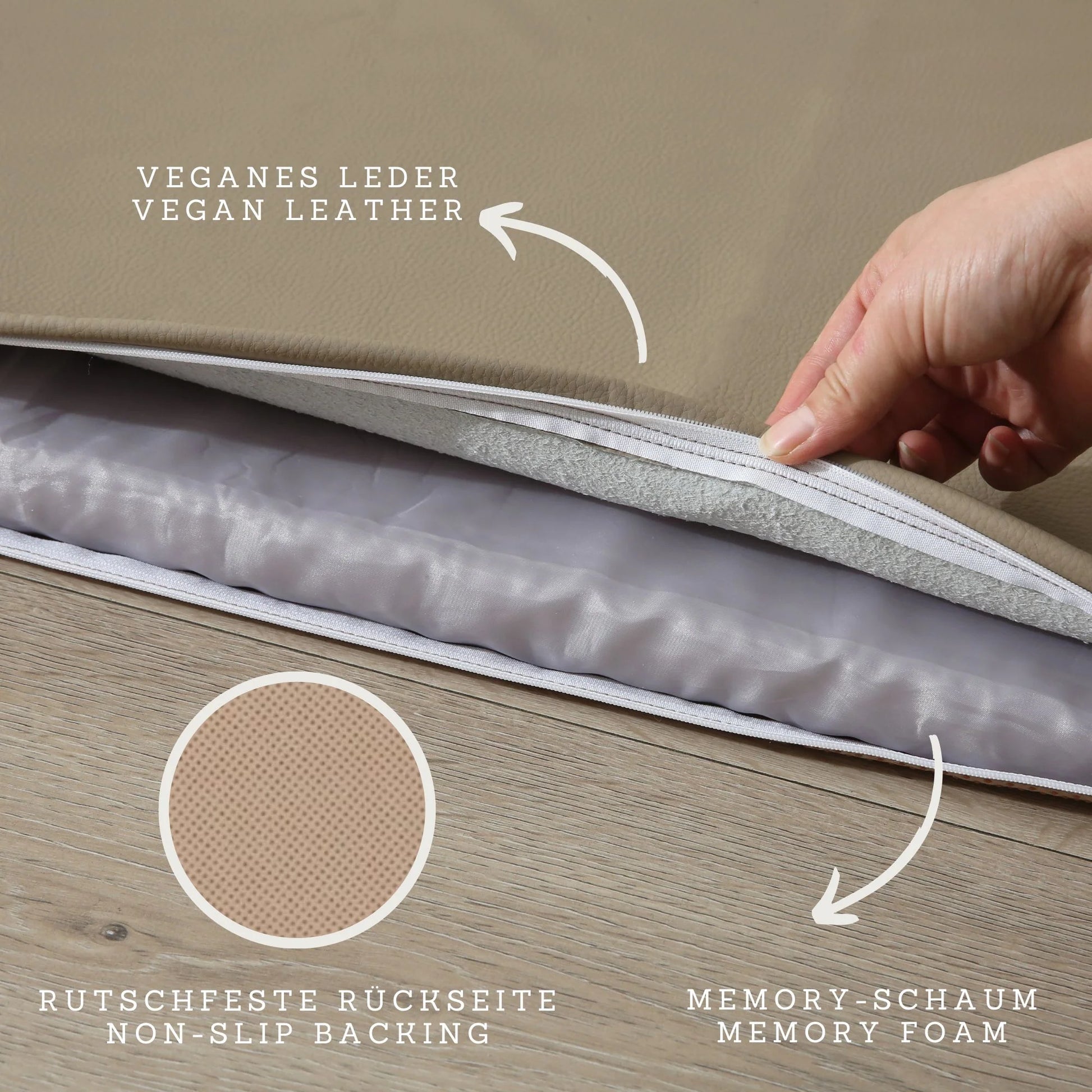Langlebig und einfach zu montieren: Gefertigt aus hochwertigem Memory-Schaum mit 2 cm Stärke, kehrt die Matte innerhalb von 1-2 Tagen in ihre ursprüngliche Form zurück - ein klarer Vorteil gegenüber günstigeren Alternativen. Die Montage ist unkompliziert: Legen Sie die Matte in den Bezug aus veganem Leder, schliessen Sie den Reissverschluss - und schon ist die Baby Krabbeldecke einsatzbereit.
