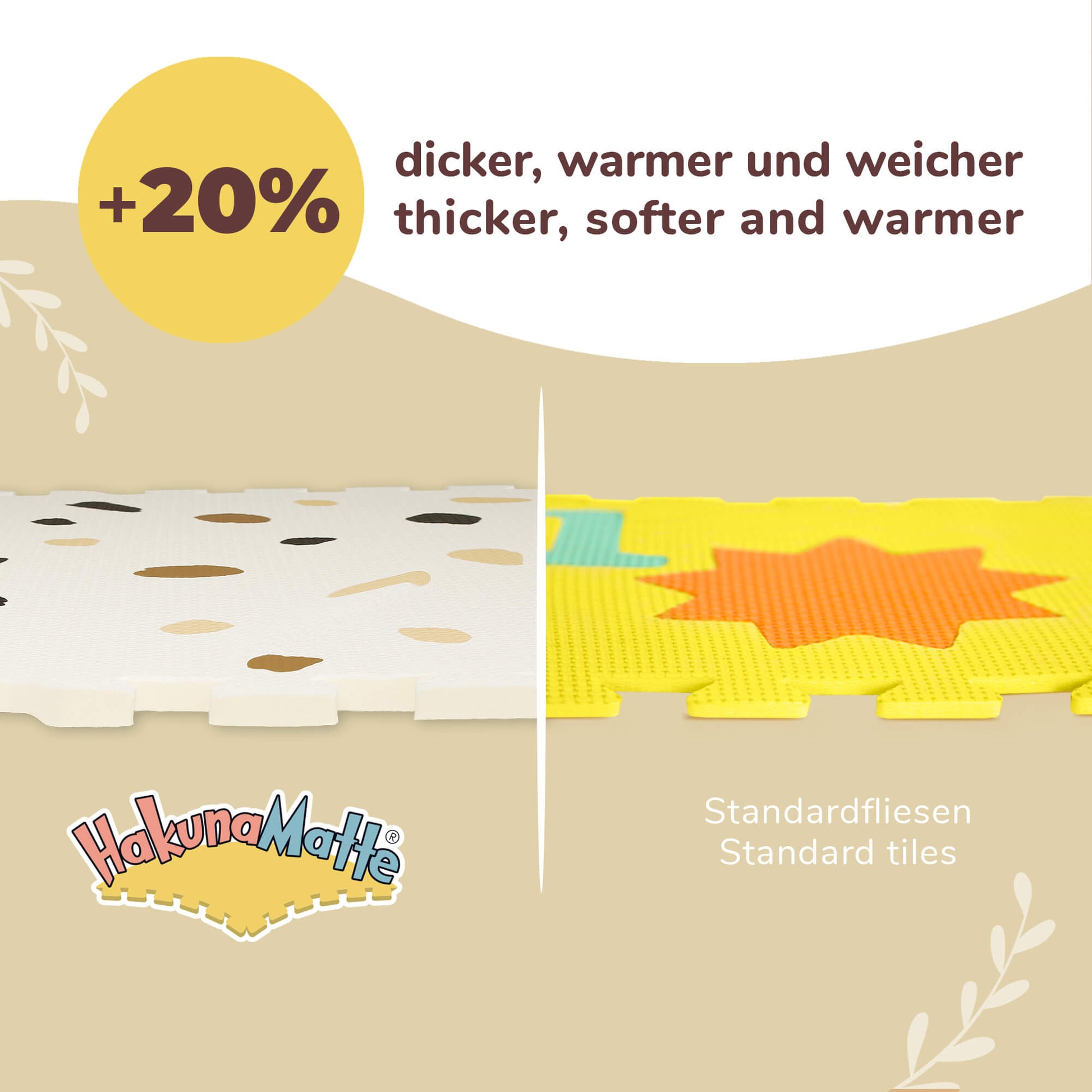 • DIE 20% DICKERE Puzzlematte wird aus dem hochwertigen EVA-Schaumstoff gefertigt und ist 1,2 cm dick. Dank sicherer Verzahnung und grosser einteiliger Tierformen liegen die Platten eng zusammen und sorgen für ein angenehmes Polster auf harten und kalten Böden.