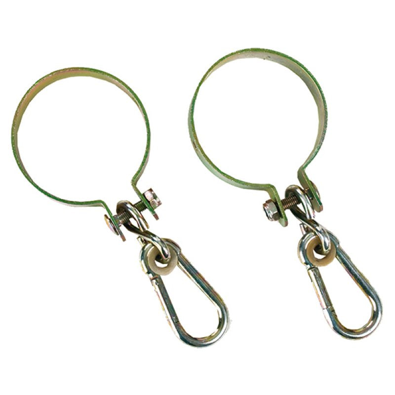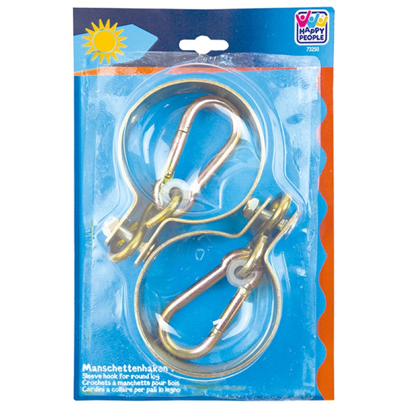 Manschettenhaken für Rundholz ca. 100mm Durchmesser mit Karabinerhaken, bis 200kg Tragkraft, goldverzinkt.