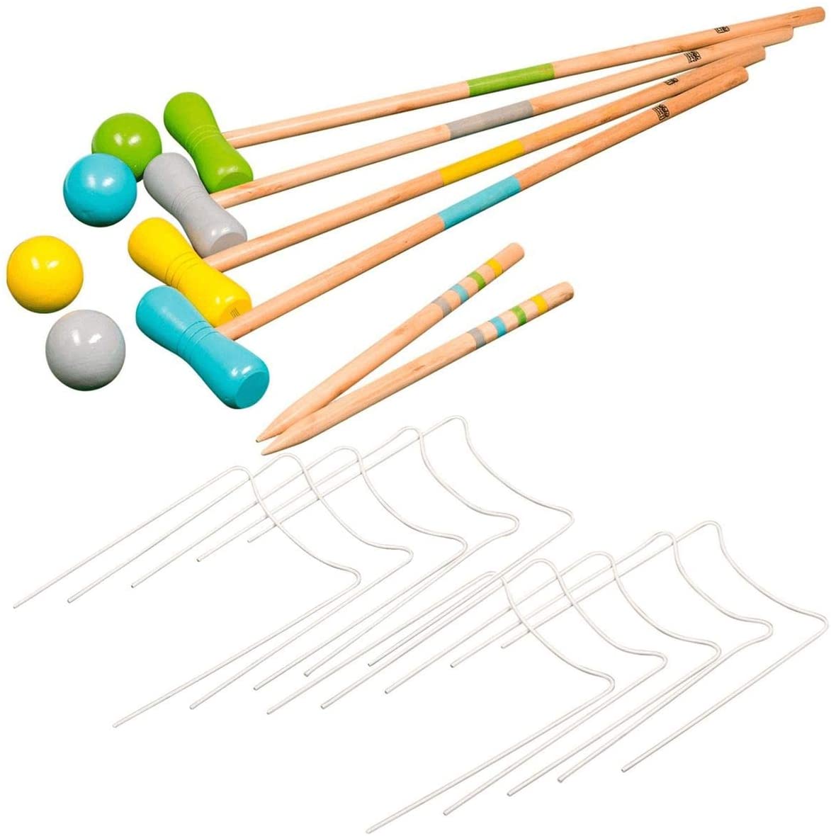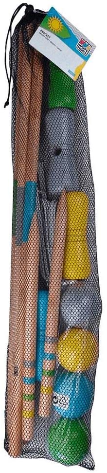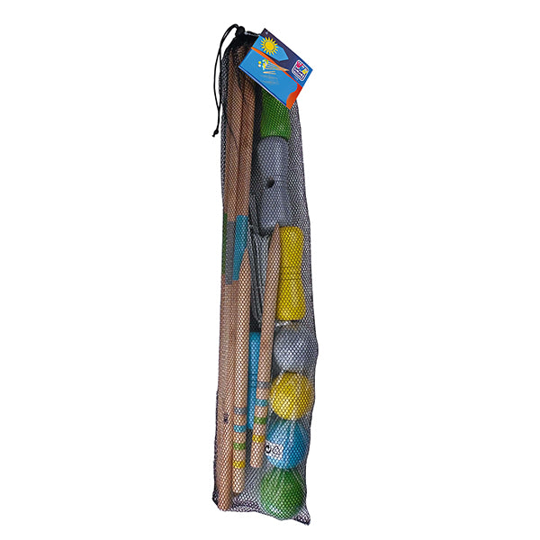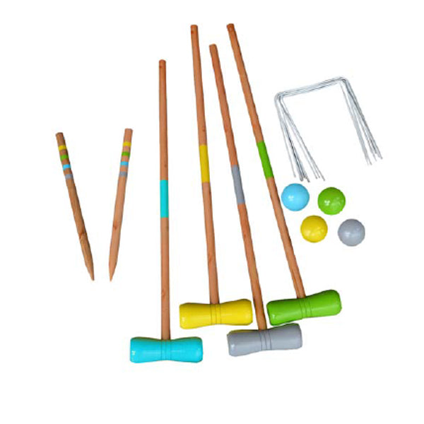 Krocketspiel für 4 Spieler inklusive 4 Kugeln (7.5cm) und 10 Tore. Griffgrösse: 75x2cm, Hammergrösse: 14.5x4.5cm.