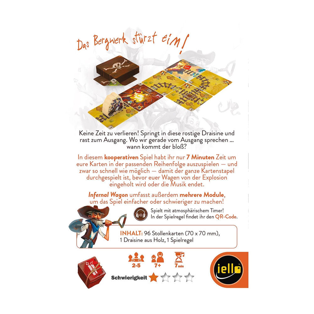 Oh nein, das Bergwerk stürzt ein! Beeil dich, spring in den Wagon und rase zum Ausgang! Infernal Wagon ist ein lustiges kooperatives Spiel, bei dem die Spieler zusammenarbeiten müssen, um einen Weg zum Ausgang zu finden... bevor die Zeit abläuft! Aber Vorsicht: Jede ausgespielte Karte kann verheerende Effekte auslösen!