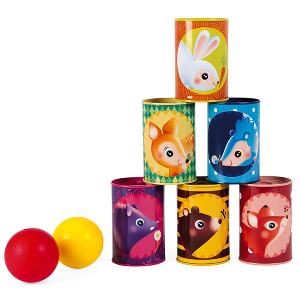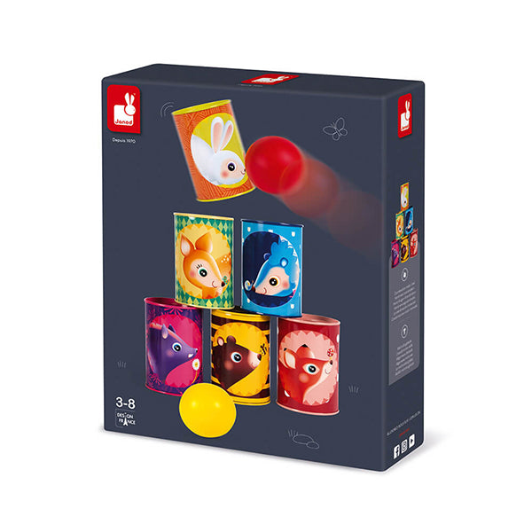 Viel Spass beim Versuch, alle Dosen mit möglichst wenigen Würfen umzuwerfen! Ein Wurfspiel mit Illustrationen von Waldtieren, bestehend aus 6 Metallkannen und 2 Schaumstoffbällen: ein Muss für jede Innenparty oder zum Spielen im Freien mit der Familie!