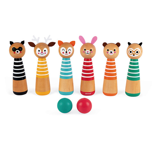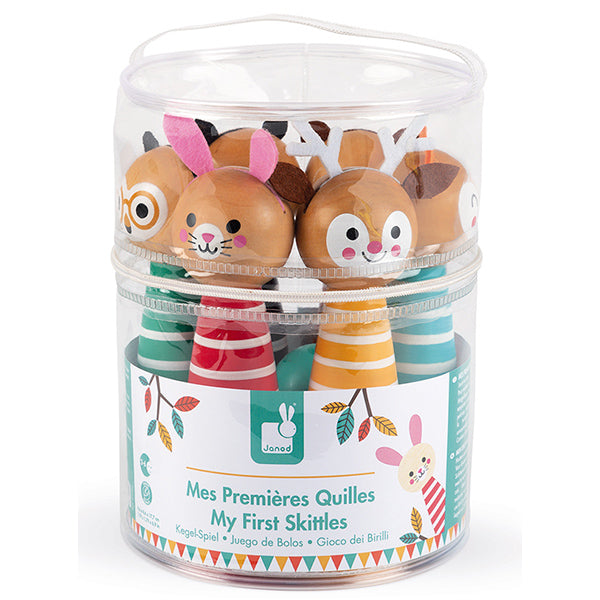 Hübsches Kegelspiel, das in seinem kleinen Beutel überallhin mitgenommen werden kann. Ideal zur Entwicklung der Feinmotorik und Konzentration des Kindes.