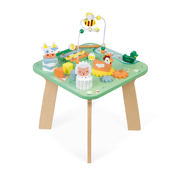 Dieser Multi-Aktivitätstisch führt die Babys aufs Land mit seinen schönen Wildblumenfeldern, wo sie alle Bauernhoftiere finden werden! Also, auf geht's, zeigen Sie Ihrem Kind neue Spiele mit diesem vielseitigen Tisch, der sieben Aktivitäten bietet: Zwei Tiere zum Stapeln auf zwei verschiedene Arten, um die Feinmotorik zu entwickeln; ein Labyrinth mit einer Ente, die durch ihren Teich geführt werden soll, um die Hand-Augen-Koordination zu verbessern; ein Zahnradsystem zum Drehen, um das Kind mit dem Ursache-Wirkung-Prinzip vertraut zu machen; drei Klötze zum Einstecken, um die Formen zu erlernen; ein Abakus, um die Konzentration zu fördern, und ein Metallxylofon mit seinen zwei Schlägeln für die musikalische Früherziehung. Mit diesem Aktivitätstisch aus Holz zur frühkindlichen Erziehung können Kinder ab 12 Monaten in einer Welt, die ihnen gefällt, eine Entdeckung nach der anderen machen! Tischhöhe: 32 cm. Farbe auf Wasserbasis.