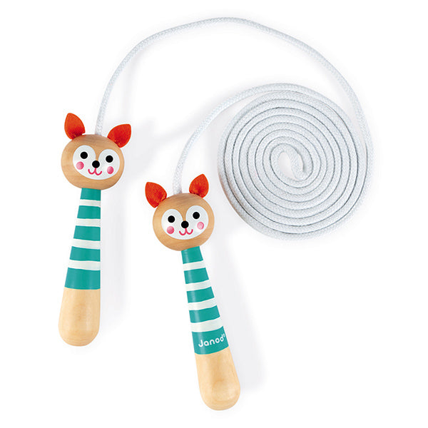 Das Springseil hat Holzgriffe und der Tierkopf Filzohren. Die Länge des Seils kann man verstellen, indem man den Kopf des Tierer abschraubt. Länge des Seils: 2m.