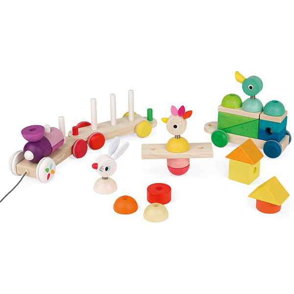 Holzspielzeug 52 x 8.5 x 18 cm aus FSC für Kinder von 12 bis 36 Monaten. Steck die deinen Zug zusammen, setze Ente, Huhn und Hase in den Zug und ziehe ihn dann hinter dir nach.