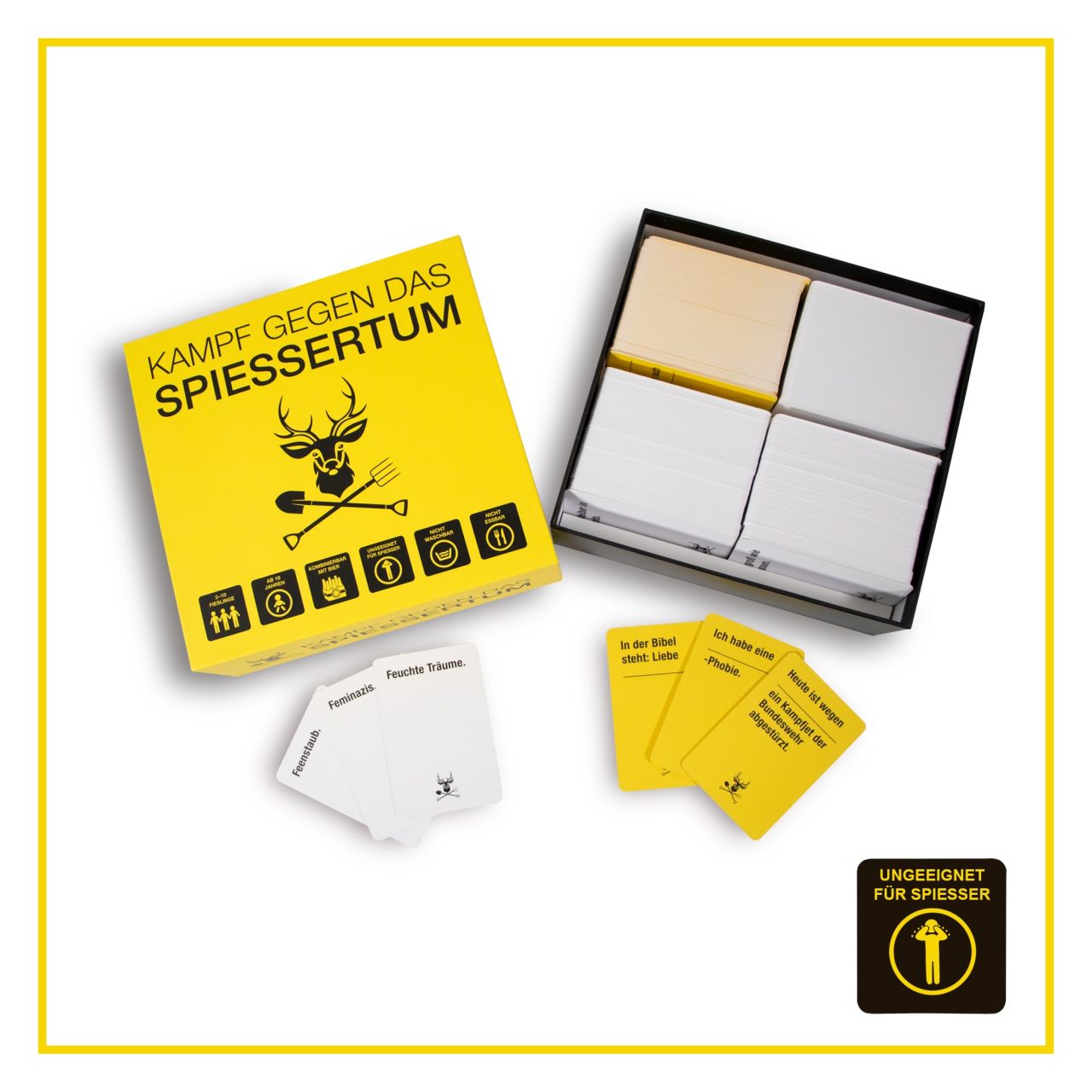 Kampf gegen das Spiessertum funktioniert nach dem gleichen Spielprinzip wie das in Amerika sehr beliebte Card against Humanity. Die Inhalte sind mindestens genauso schwarzhumorig wie das Vorbild, aber perfekt auf den deutschen Markt abgestimmt - mit deutschen Promis, Orten und Klischees.