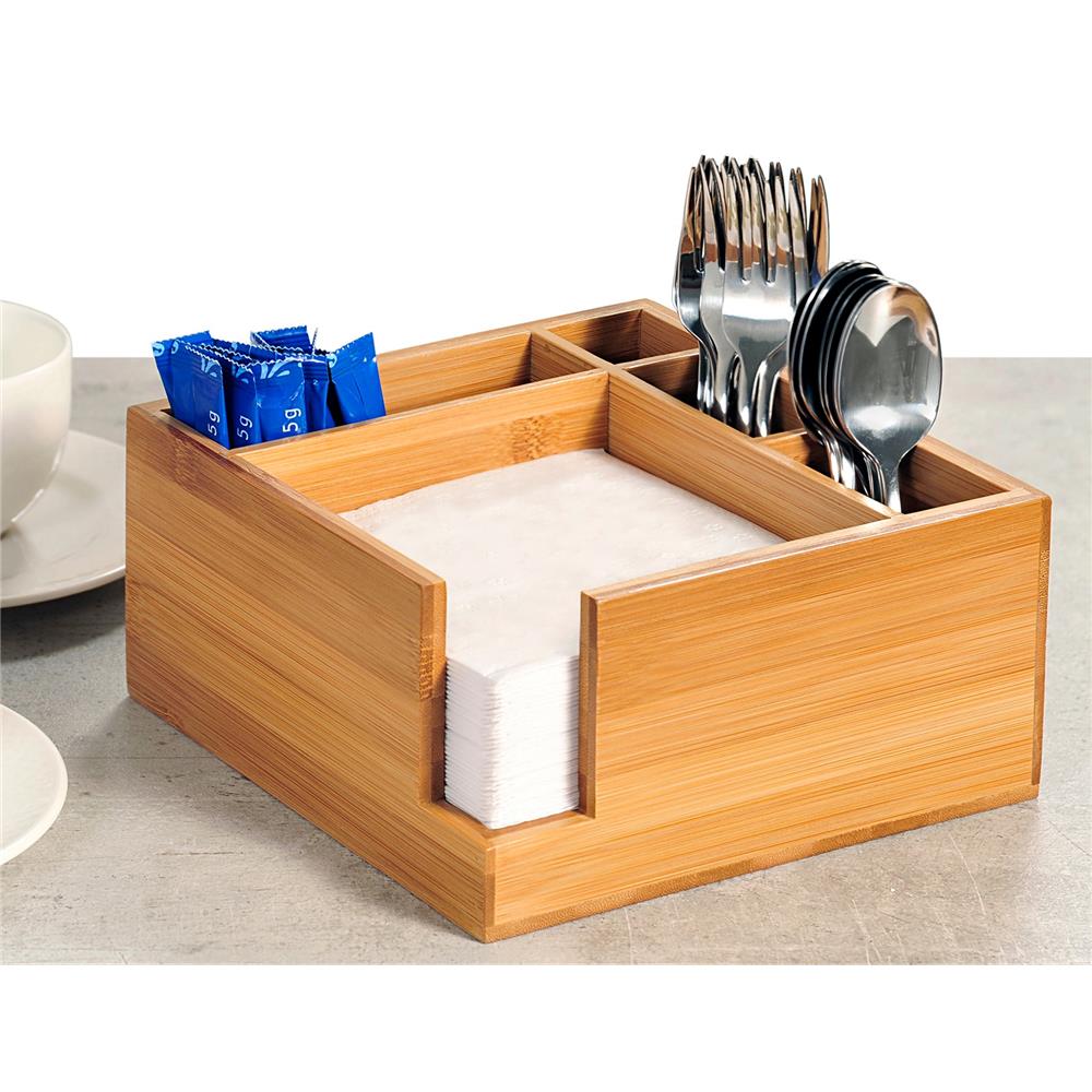 Die fünf Fächer des Serviettenspenders bieten eine ideale Lösung für Ordnung und Systematik. Ob Servietten, Besteck, Zucker oder andere Utensilien, alles lässt sich übersichtlich anordnen und ist stets griffbereit für Sie, Ihre Familie oder Gäste.
