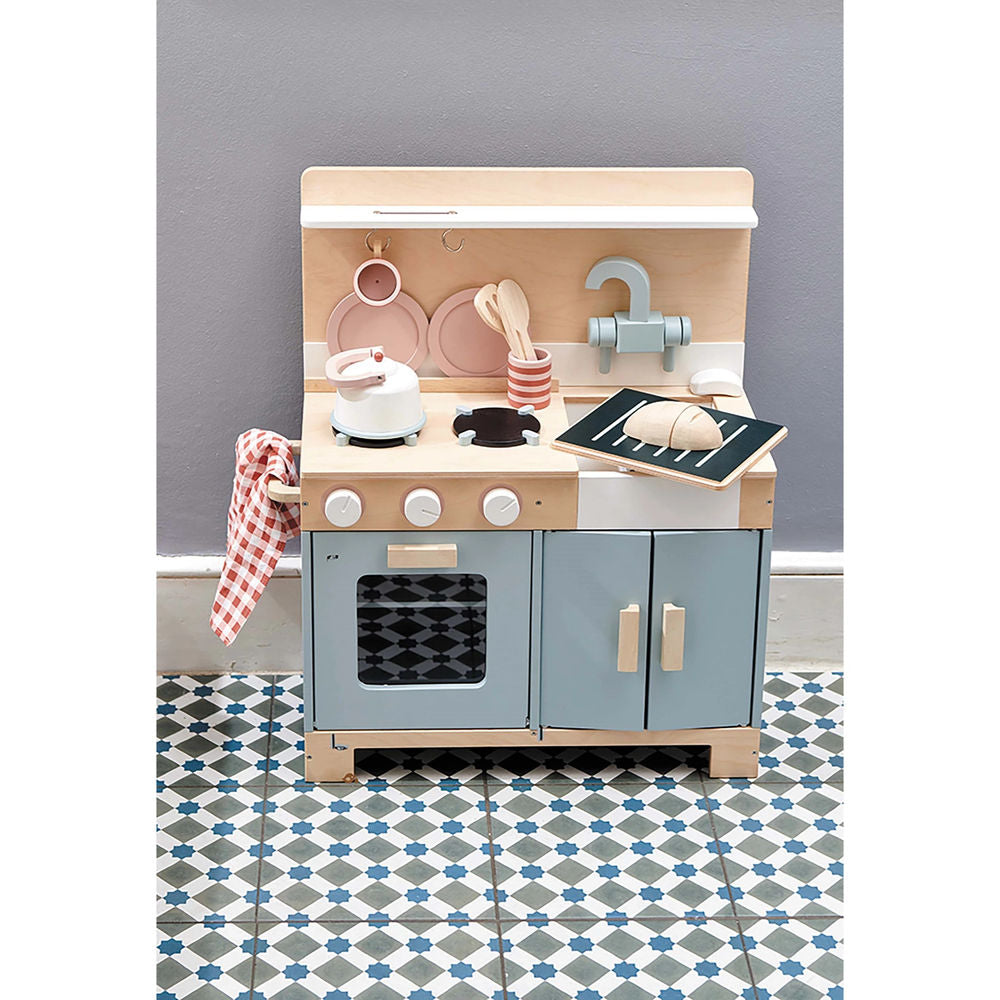 Da macht kochen Spass! Die Küche mit Backofen, 2 Herdplatten, einem Spülbecken mit Wasserhahn und einem Unterschrank mit 2 Türen hat alles, was eine moderne Küche braucht. Inbegriffen sind: ein Wasserkocher aus Holz, 2 Tassen mit Untertellern, 3 Küchenutensilien mit Halter, ein kariertes Küchentuch, Seife, ein Brot in Scheiben und ein Backblech, mit dem man das Waschbecken abdecken kann, um zusätzliche Arbeitsfläche zu gewinnen.